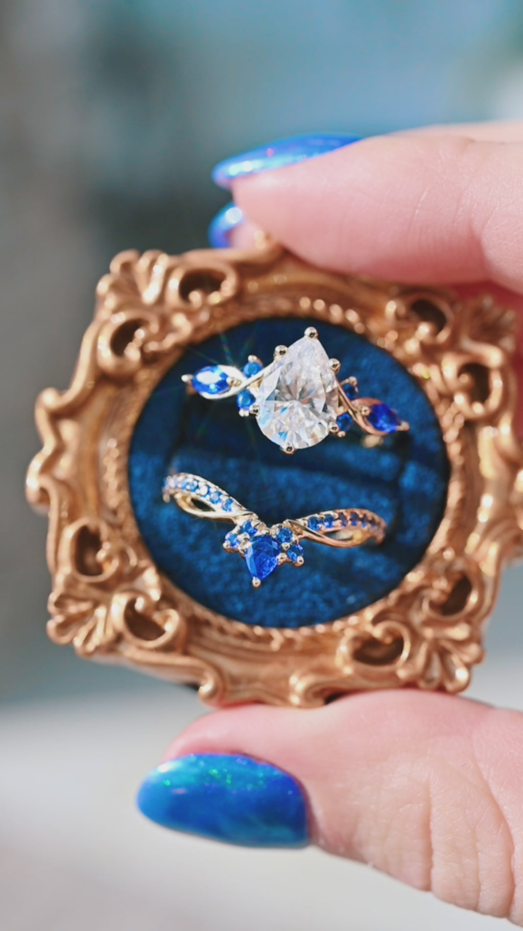 Step into a world of enchantment with this Feyra Blue Sapphire and Lab-Grown Diamond Engagement Ring Set in 14K solid yellow gold. Designed for the woman who dreams of magic and elegance, this set perfectly blends whimsy with timeless sophistication.