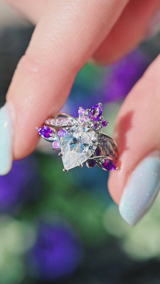 ►The centerpiece features a brilliant lab-grown diamond, celebrated for its exceptional sparkle and fire. Surrounding the center stone is a halo of natural amethyst accents, known for their soothing purple hues and symbolism of clarity and love. The white gold band is intricately detailed with delicate, nature-inspired accents, evoking the ethereal beauty of a fairy-tale forest.