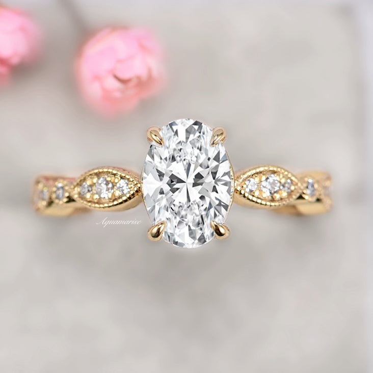 This vintage inspired engagement ring features shimmering scalloped pavé lab-grown diamonds that extend half of the way around the ring. A lab-grown diamond-encrusted gallery and milgrain makes this ring truly spectacular.