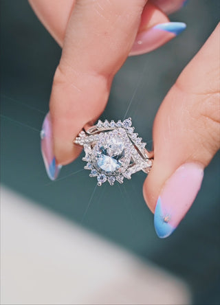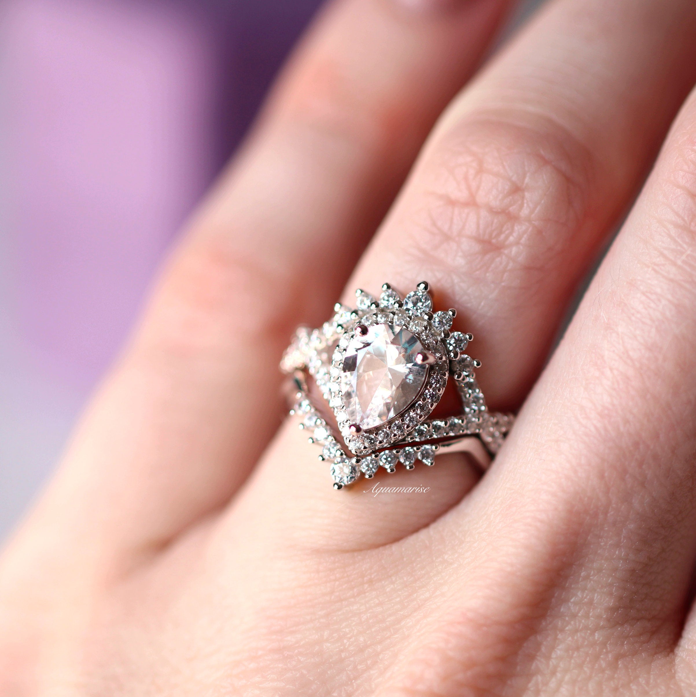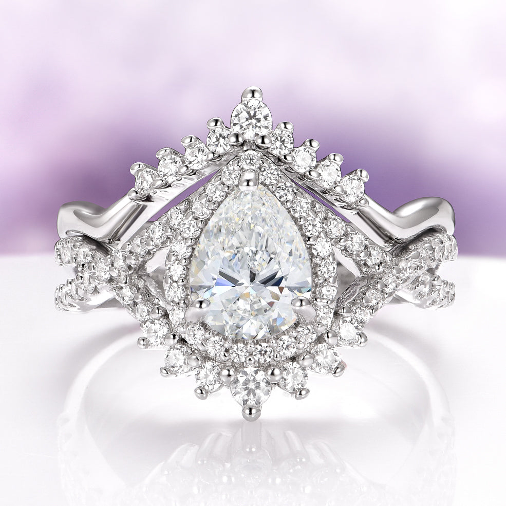 Introducing the Teardrop Lab-Grown Diamond Engagement Ring Set, a modern yet timeless design that radiates brilliance from every angle. Handcrafted in solid 14K white gold, this heirloom-worthy set features a dazzling pear-cut lab-grown diamond as the centerpiece, surrounded by a shimmering halo. The twisted band is accented with additional lab-grown diamonds, adding graceful movement and sparkle. A perfectly matched chevron wedding band, also set with lab-grown diamonds, completes the set with elegance and symmetry. Distinctive yet enduring, this design is the perfect symbol of everlasting love.