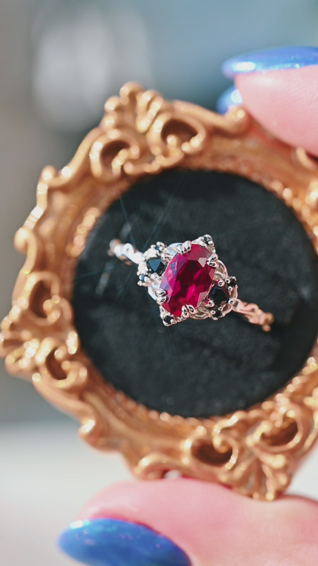 ► Ruby is celebrated for its intense pinkish red hue and exceptional clarity, symbolizing passion, strength, and enduring love. Paired with deep black onyx accents, cherished for their grounding and protective qualities, this ring evokes a bold sense of romance and resilience. Ideal for lovers of fantasy-inspired jewelry, fairycore engagement rings, or meaningful gemstone gifts, the Esme Ring offers an unforgettable expression of love.