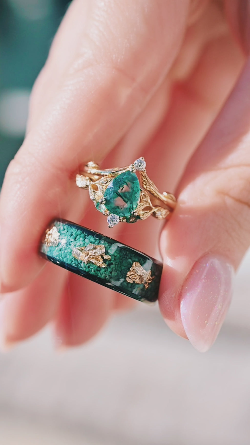 ►Material: Tungsten Carbide, Crushed Green Moss Agate, and Gold Leaf (Gold Foil).