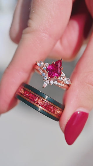 Introducing the resplendent Rose Gold Foil Leaf Crushed Red Ruby Ring – Black and Rose Gold Two Tone Men's Wedding Band, a stunning testament to the harmonious fusion of nature-inspired design and contemporary elegance. Meticulously crafted, this ring embodies a captivating balance between timeless sophistication and modern charisma, creating an exceptional symbol of enduring love and commitment.