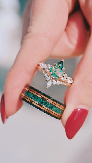Elevate your style with this Whiskey Barrel & Moss Agate Men's Wedding Band, a one-of-a-kind two-tone ring designed for the modern man. Crafted from durable tungsten carbide, this 8mm men's ring features a striking contrast of rich gold or sleek black with an inlay of genuine whiskey barrel wood and mesmerizing moss agate stone, symbolizing strength, nature, and timeless elegance.