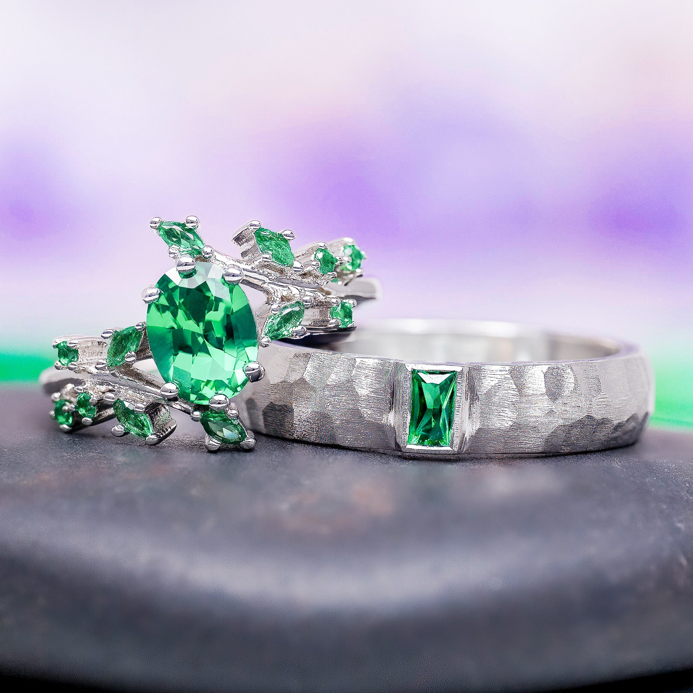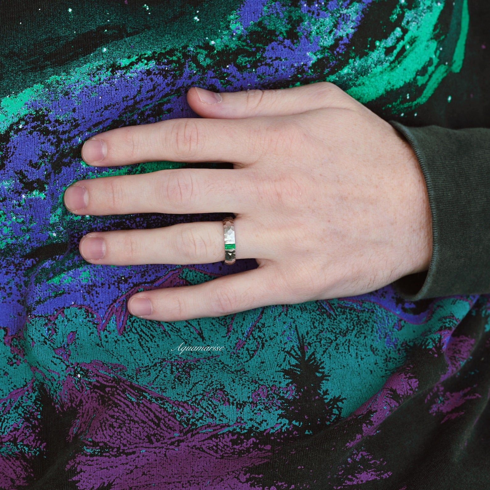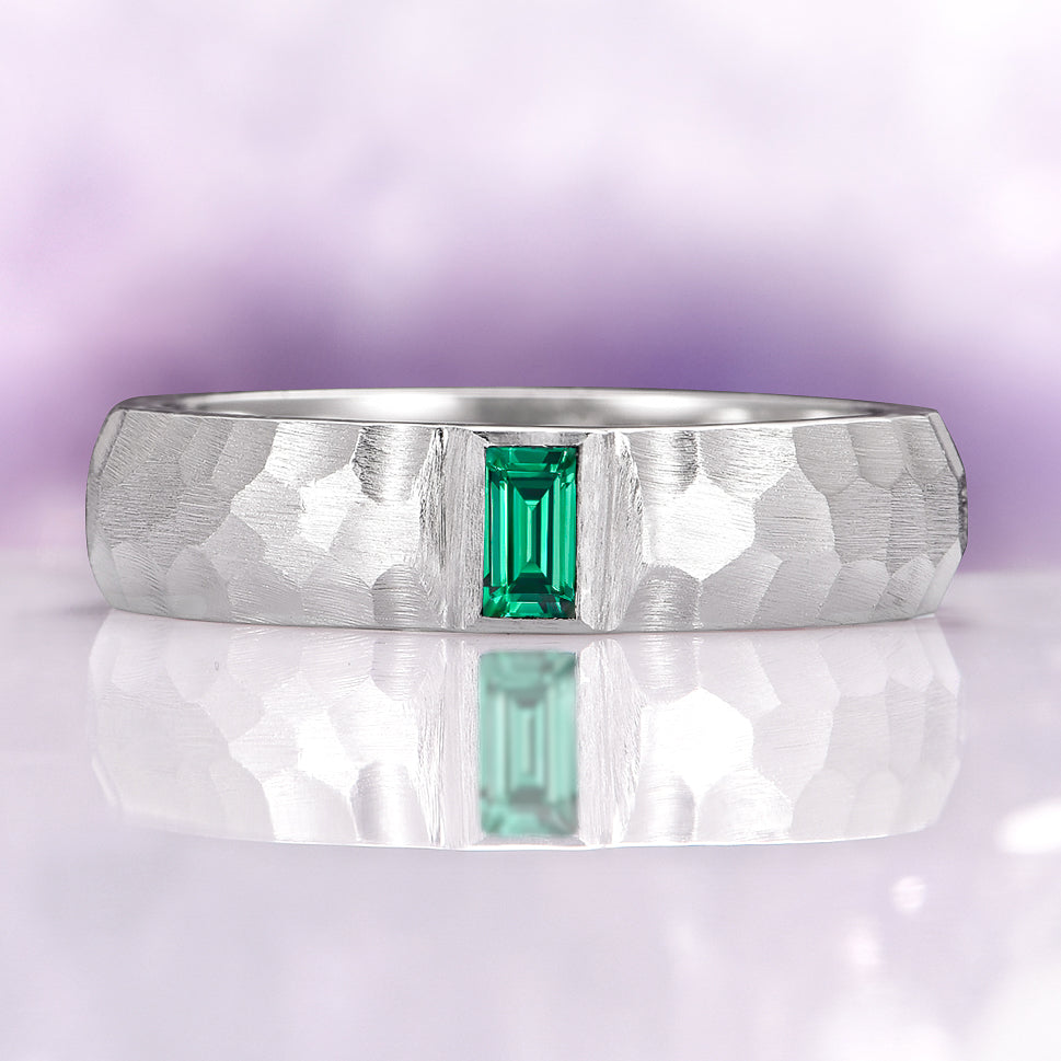 Celebrate your love with a wedding band as unique and enduring as your bond. Our Green Emerald Hammered Wedding Band is designed for both men and women who appreciate artisan craftsmanship and nature-inspired elegance.