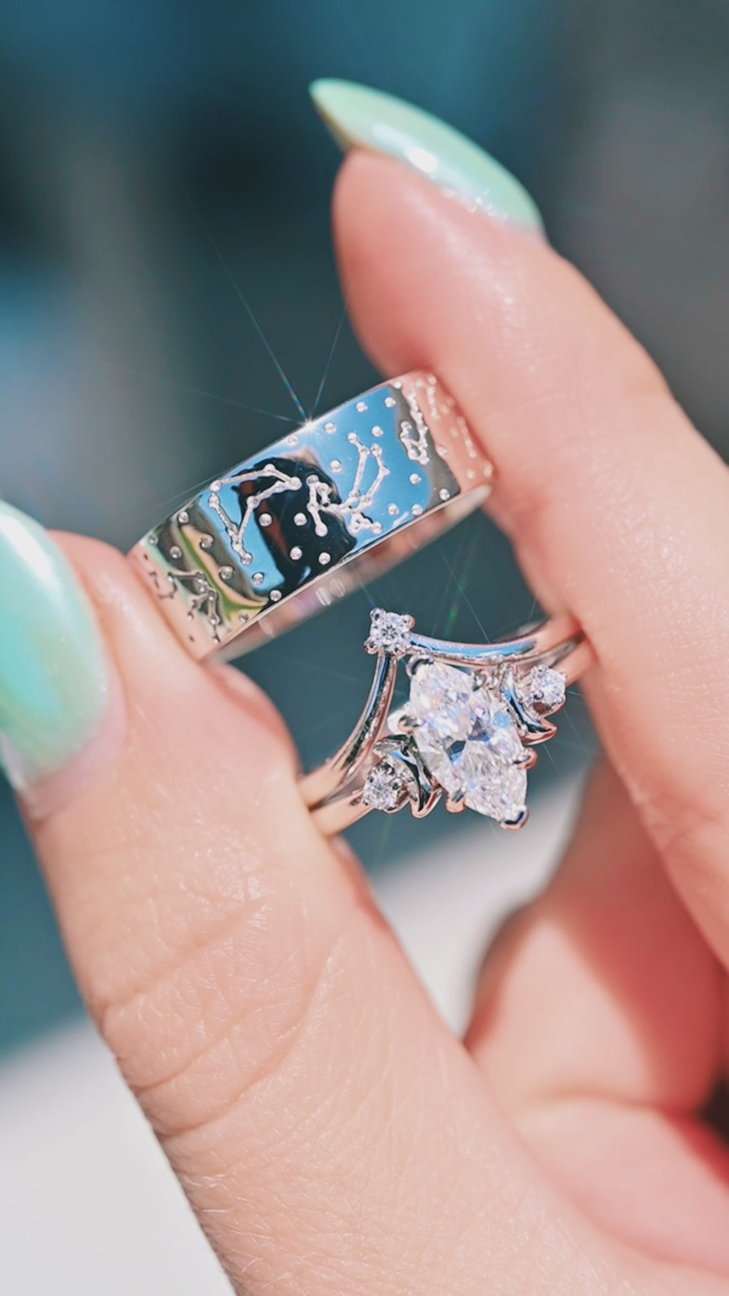 ►Each ring is meticulously etched with an exquisite constellation pattern, forming an exquisite celestial roadmap encircling the band. As light dances upon its polished silver surface, the delicate etchings come alive, creating a spellbinding interplay between light and shadow.