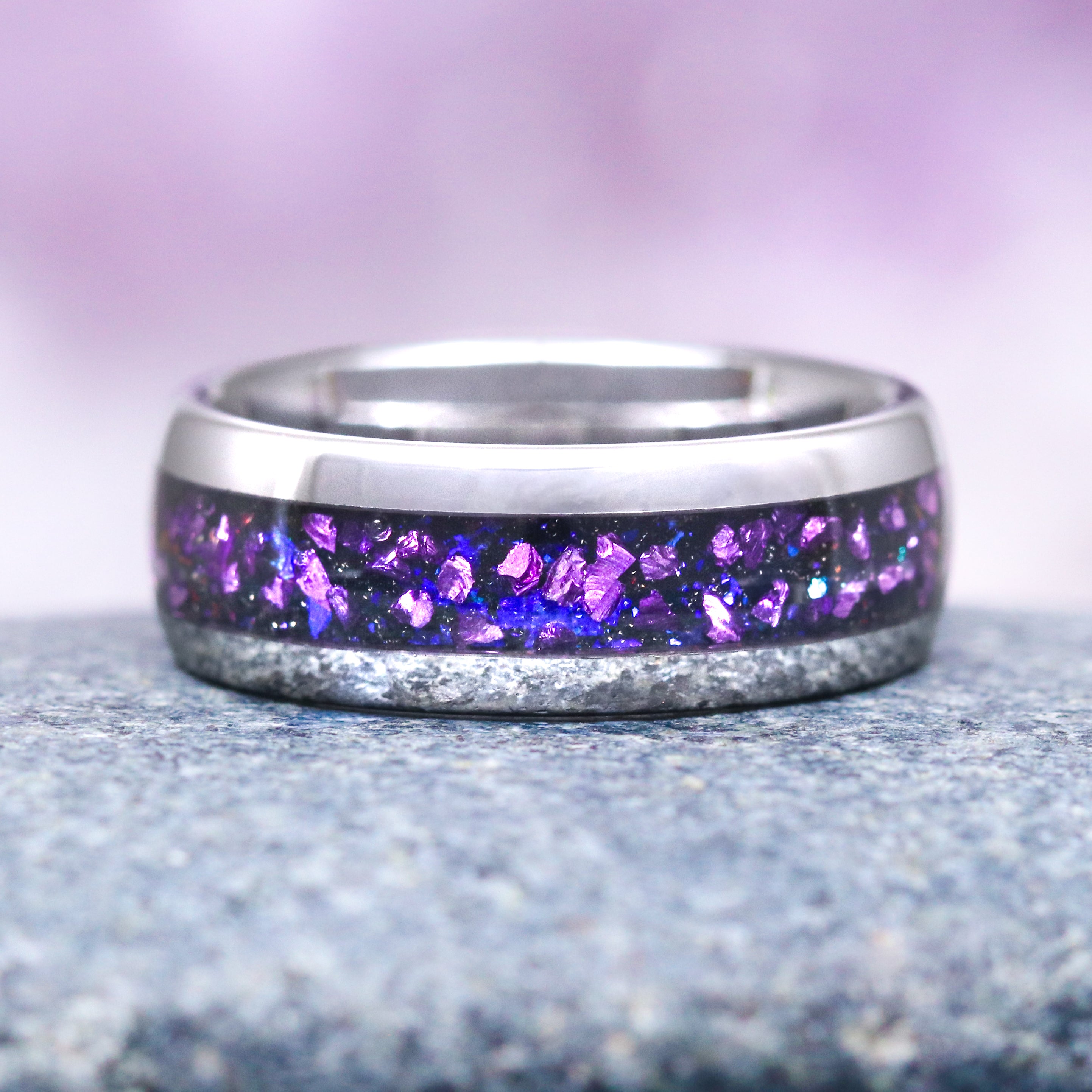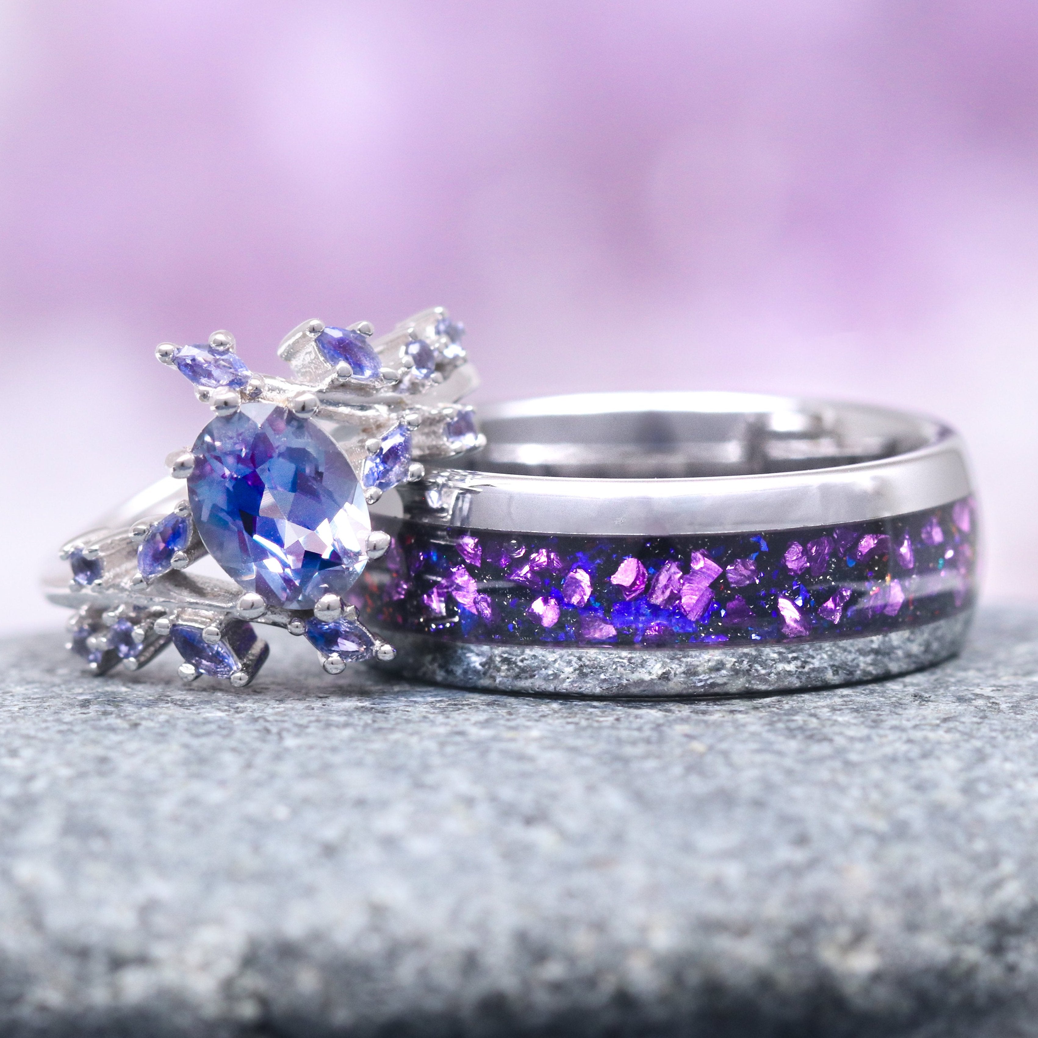 ►Please note that the color-shifting effect of Alexandrite will not be visible in this ring due to the stone being set under a resin inlay. The resin prevents sufficient light from penetrating to reveal the Alexandrite's unique color transition. This band is ideal for those who desire a rich, permanently purple hue, creating a consistent and striking cosmic aesthetic.