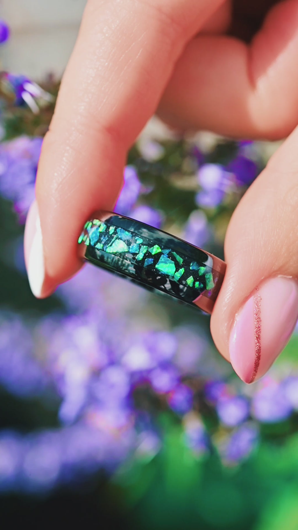 Introducing the epitome of elegance and individuality: the Crushed Green Fire Opal Men's Wedding Band, a striking symbol of everlasting love and commitment. Crafted with meticulous attention to detail, this exquisite piece seamlessly merges modern sophistication with timeless allure.