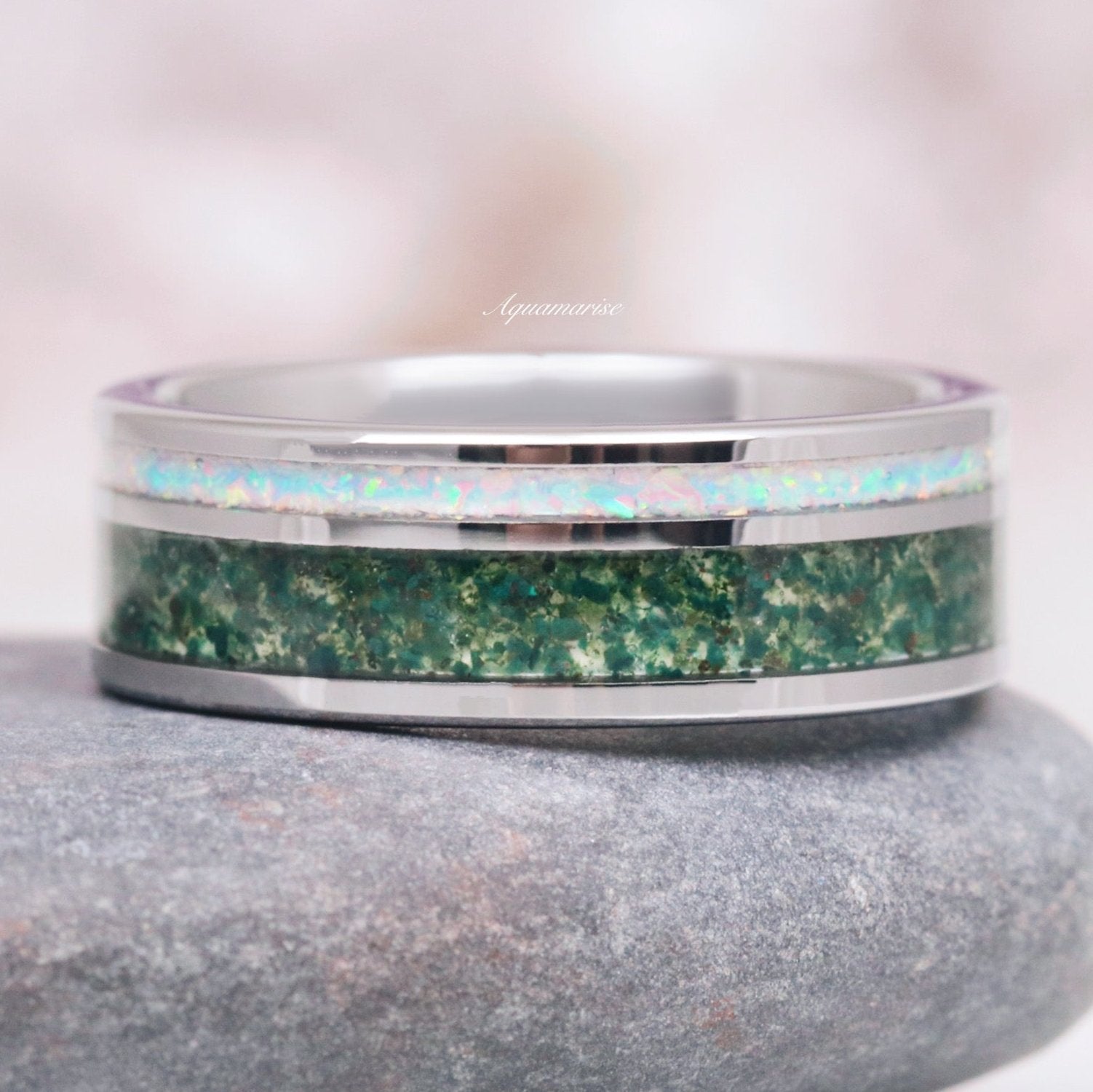 Moss Agate & Fire Opal Wedding Band- 8MM Tungsten