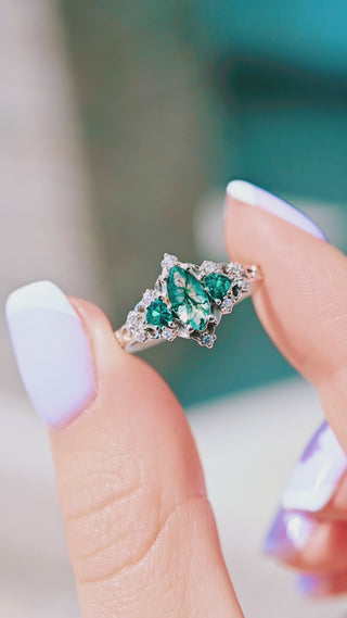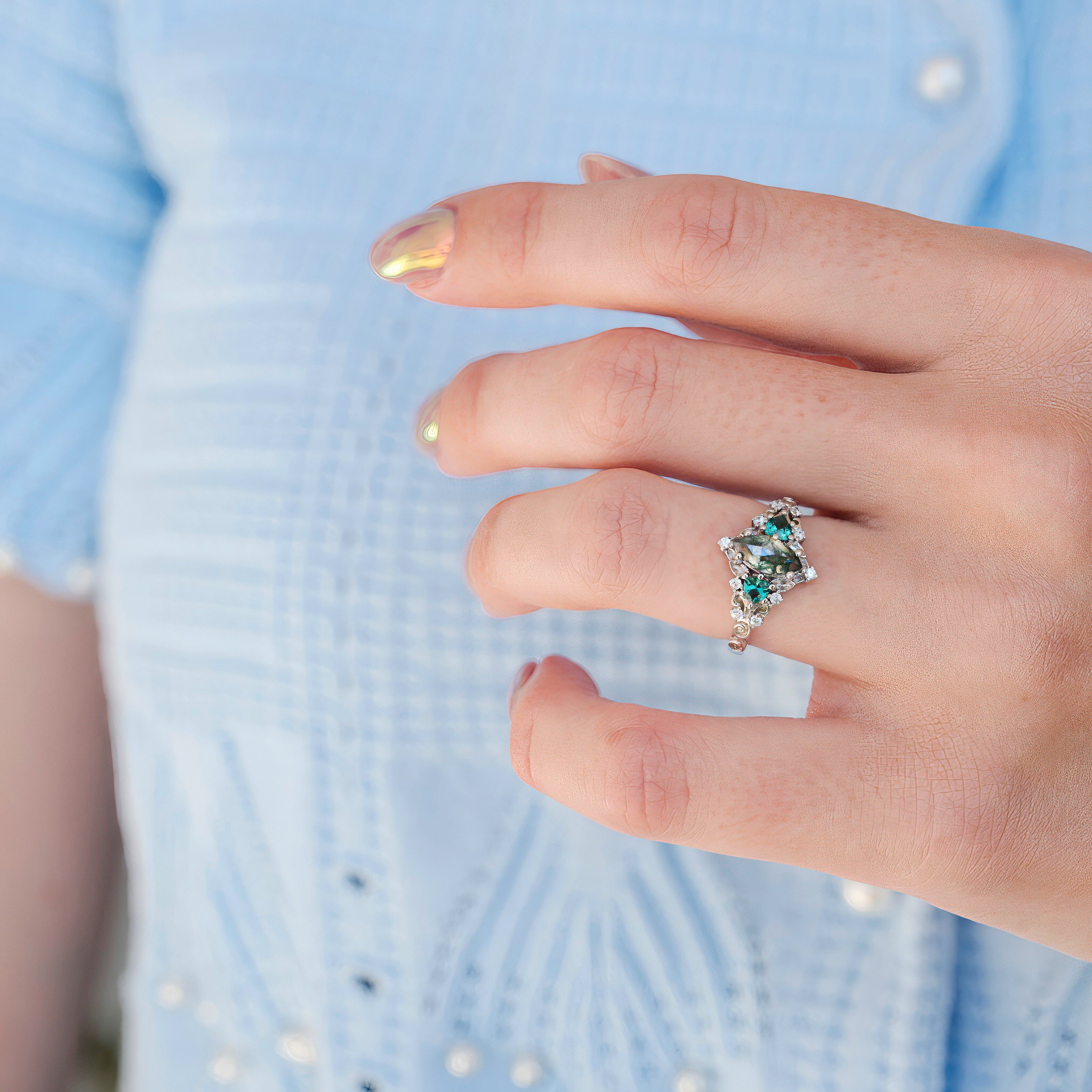 Elain Moss Agate & Teal Sapphire Leaf Ring- Sterling Silver