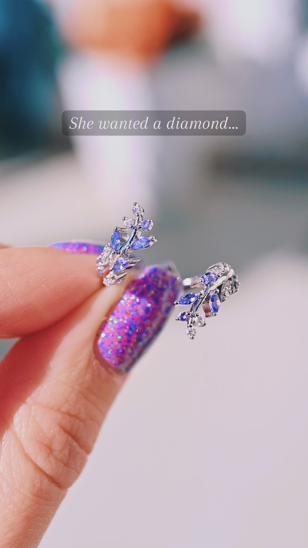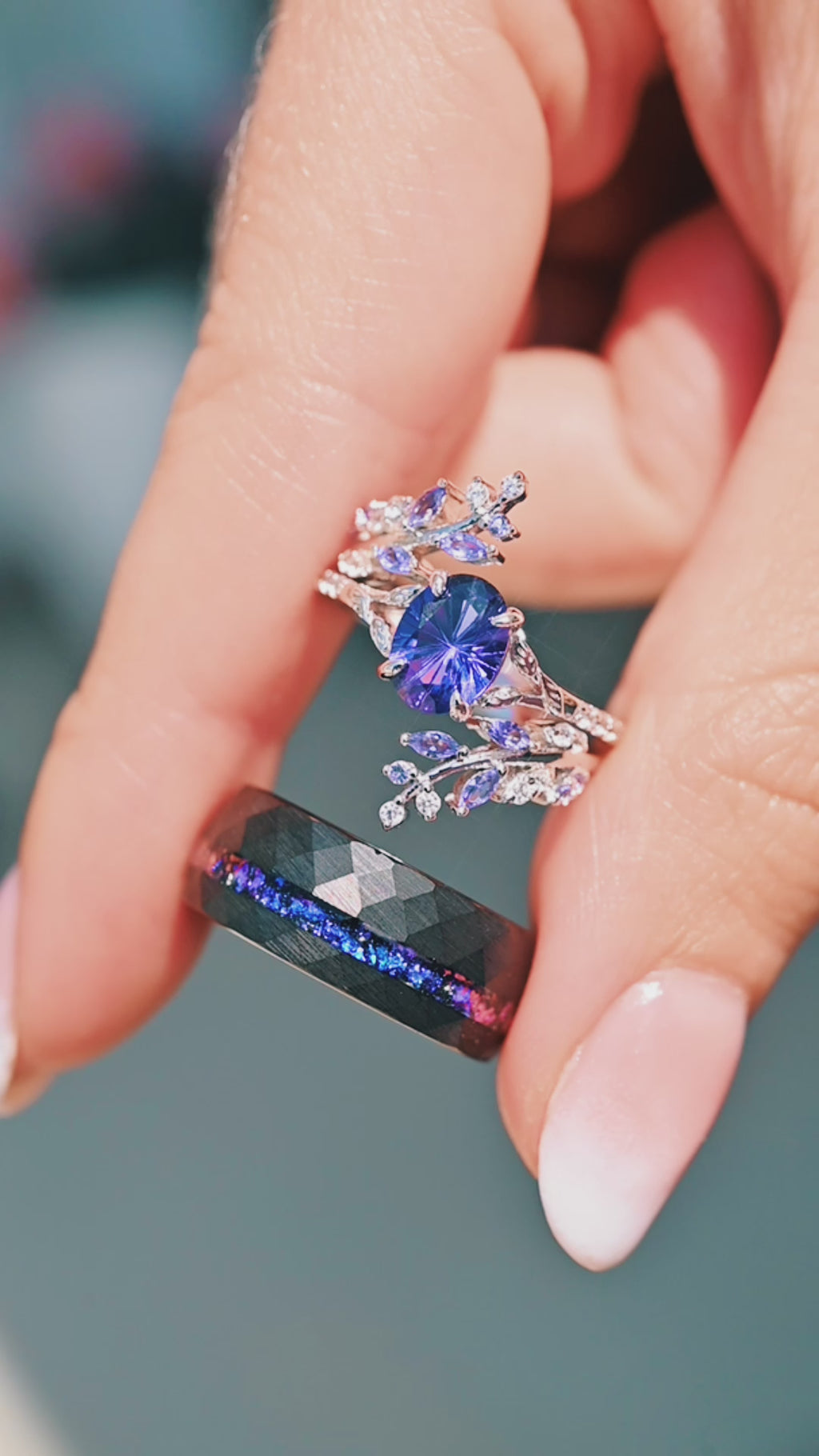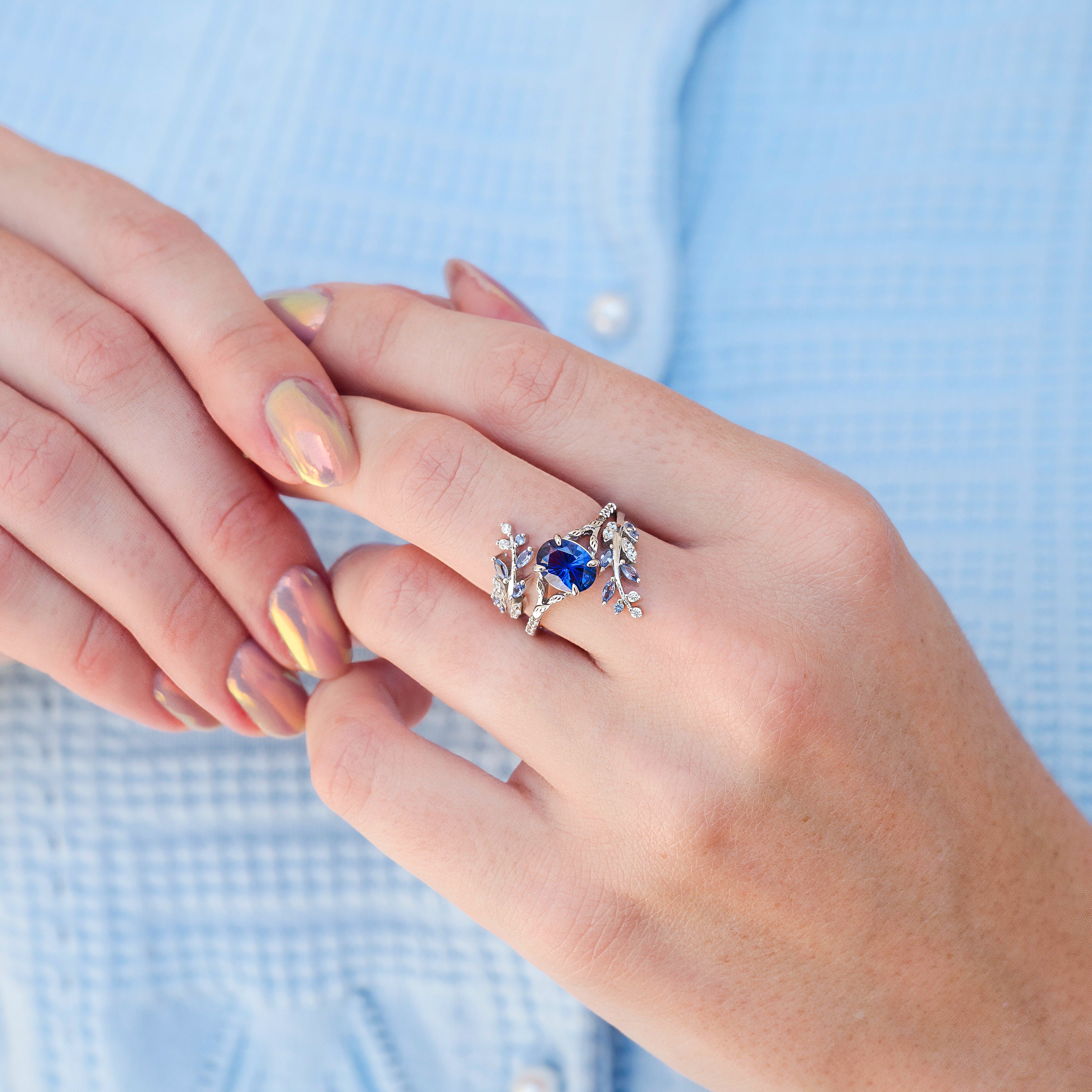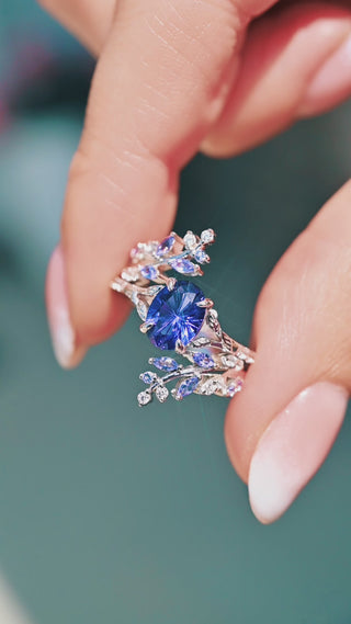 Cornflower Sapphire Fairy Leaf Ring Set- Sterling Silver