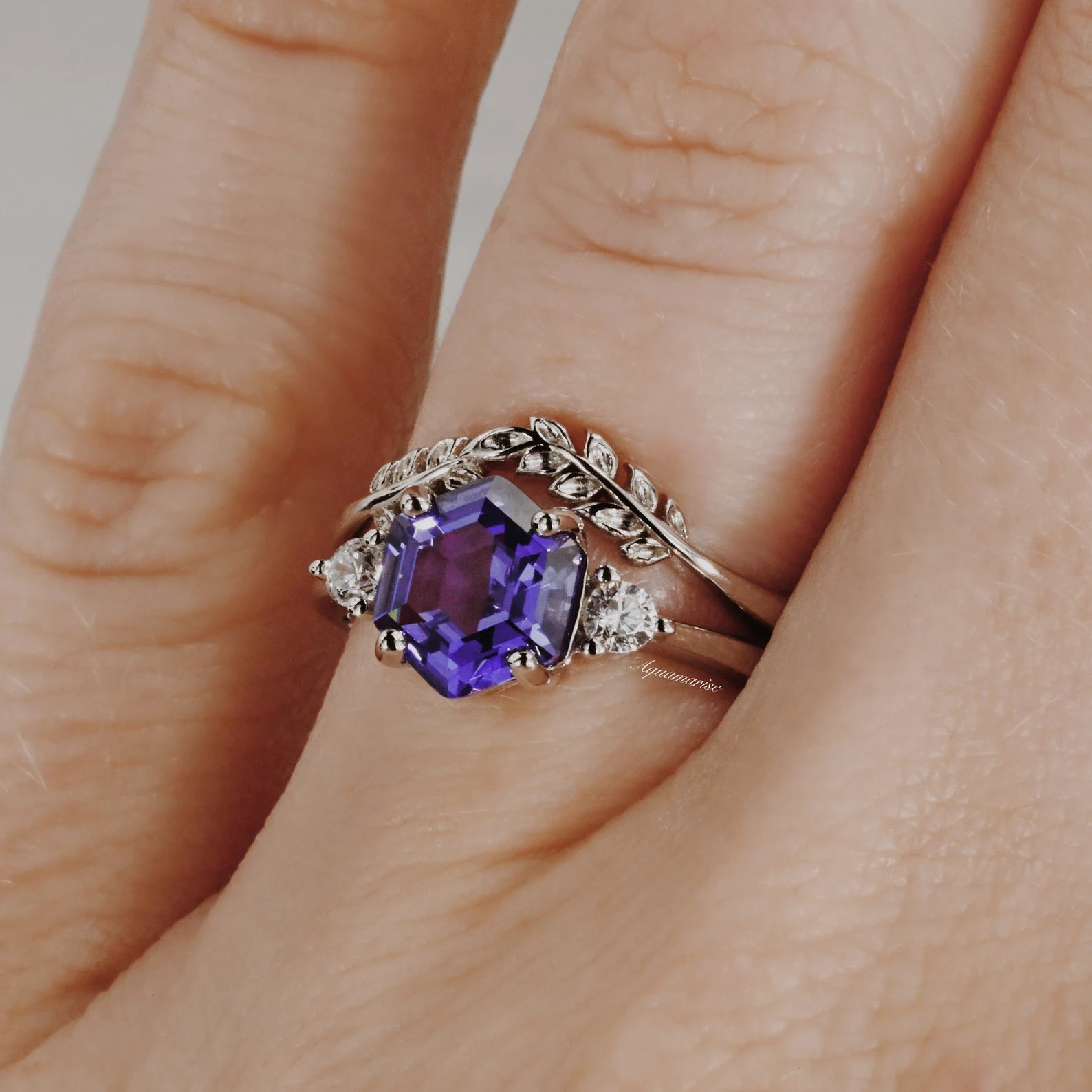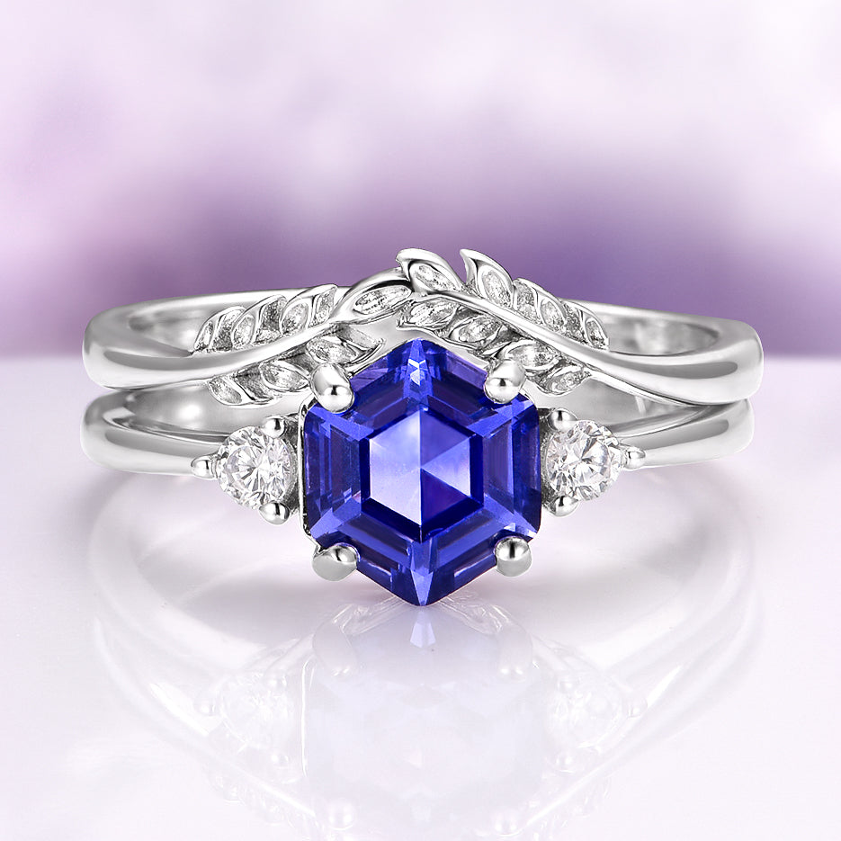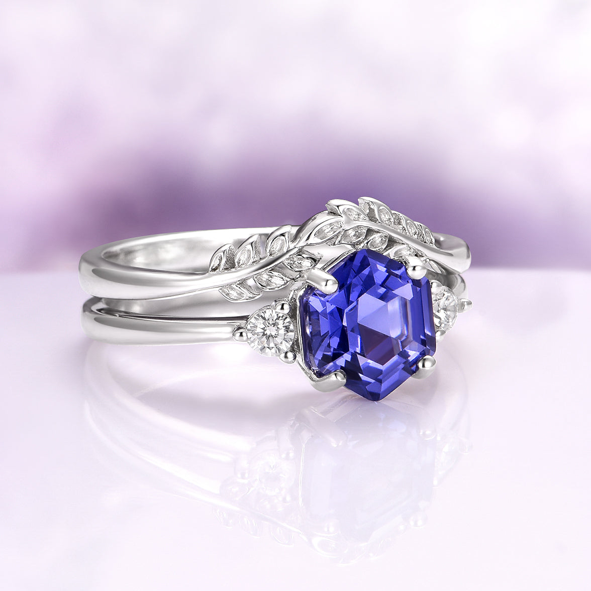 Hexagon Tanzanite Leaf Ring Set in Sterling Silver