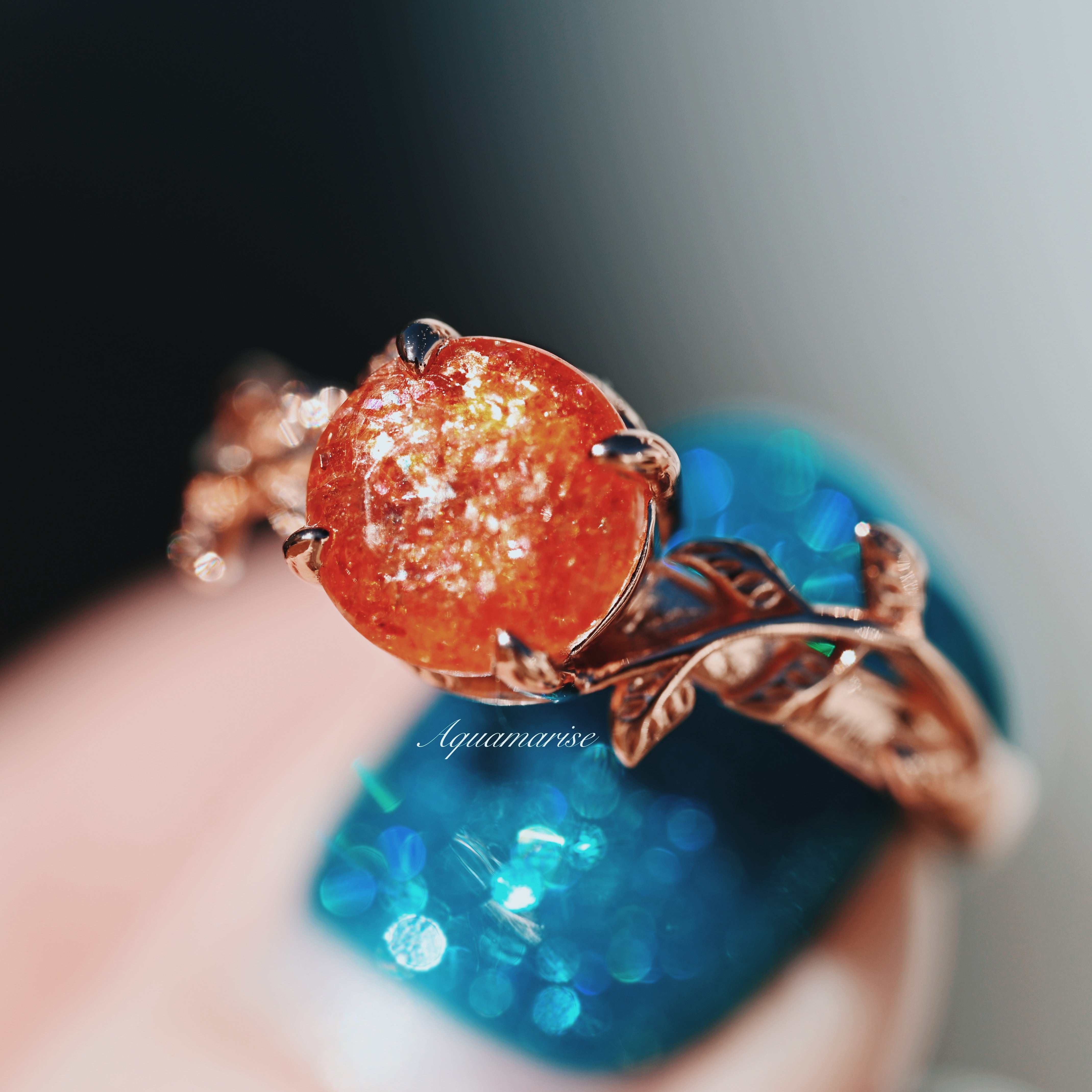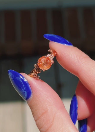 The Sunstone, known for its sparkling inclusions and coppery flashes, symbolizes joy, vitality, and confidence. Its natural golden-peach hue perfectly complements the rose gold setting, making this ring a captivating statement of natural elegance.
