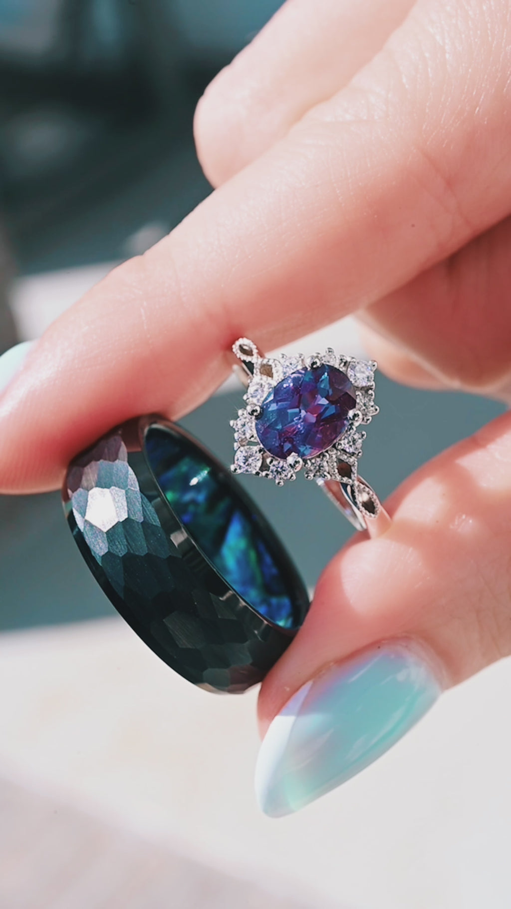 The men’s wedding band features hammered and brushed tungsten carbide with a striking natural shell inlay — a subtle oceanic shimmer set within a rugged, masculine profile. The women’s engagement ring showcases a luminous lab-grown alexandrite framed in a brilliant halo, offering elegance with modern detailing.
