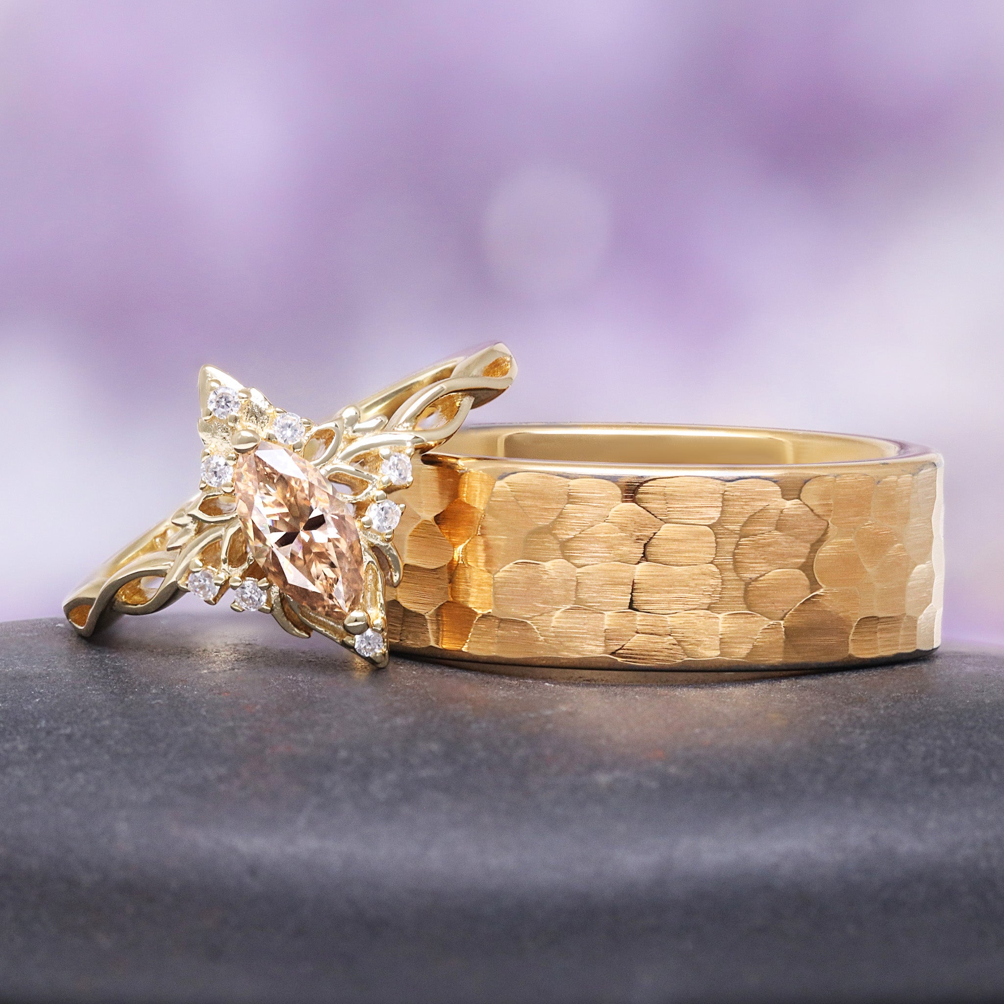 The Sun Queen Champagne Moissanite Lotus Ring paired with a bold hammered tungsten wedding band creates a couples set that feels both magical and timeless. Designed for those who believe love should feel extraordinary, this set captures romance, strength, and fantasy in perfect harmony.