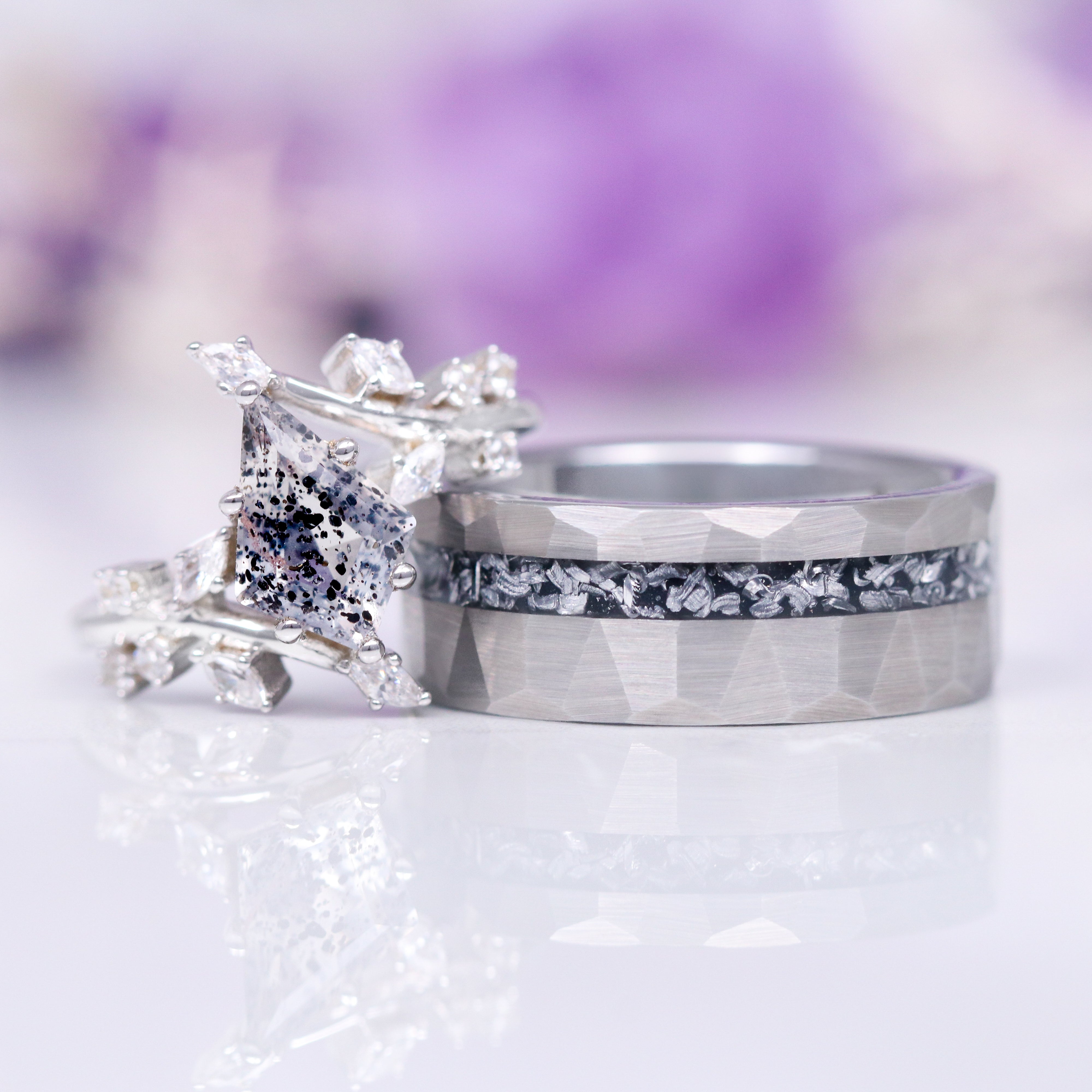 Celebrate your love with this Galaxy Salt & Pepper (Herkimer) and Meteorite Leaf Couples Ring Set, a unique and celestial-inspired his-and-hers wedding band set designed for modern couples. Crafted from sterling silver and tungsten, these matching rings capture the beauty of the cosmos with raw elegance and durability.