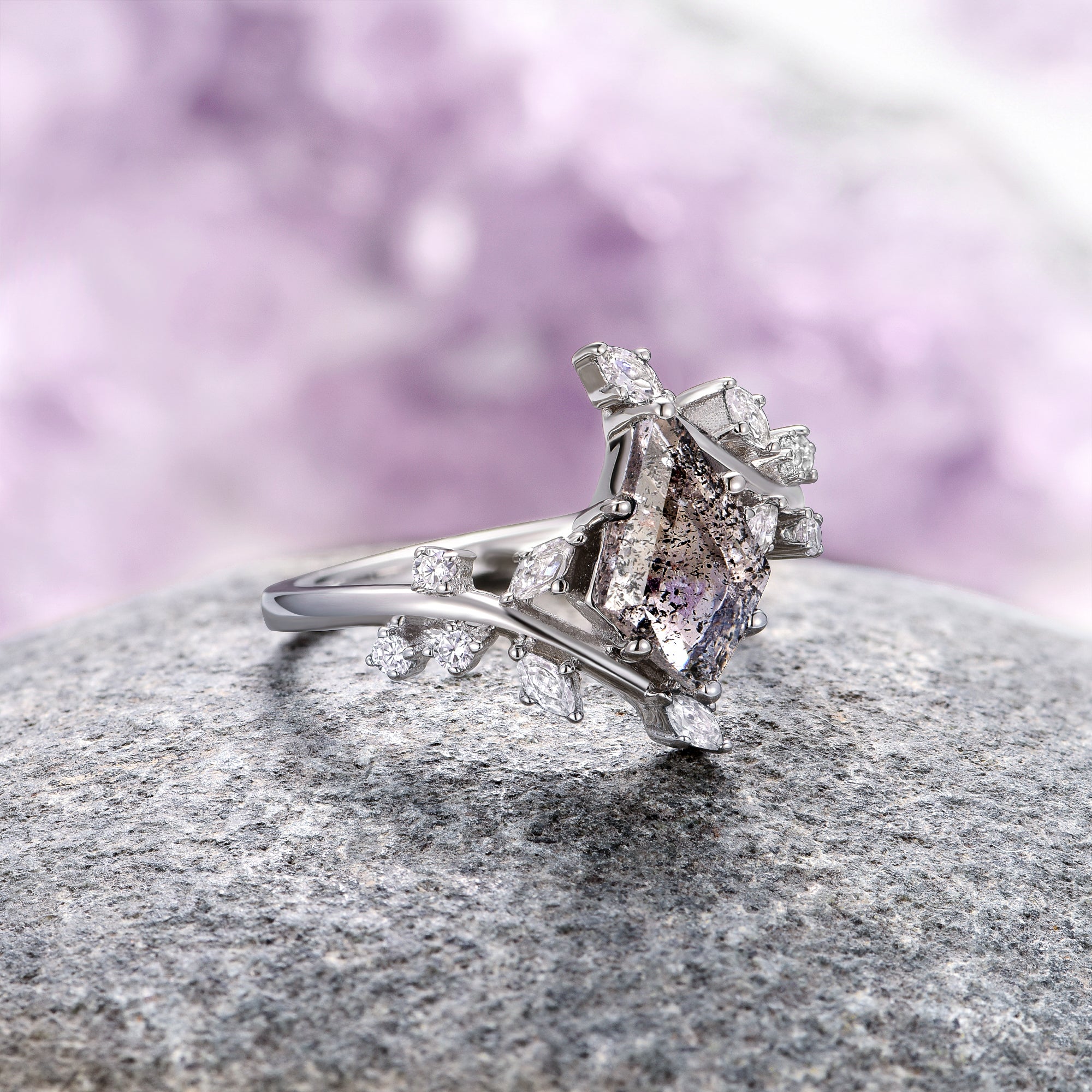 ►The women’s ring features a breathtaking natural kite-shaped Herkimer diamond, displaying a mesmerizing mix of black and white inclusions, symbolizing strength and unity. Its raw, organic beauty is a stunning representation of your one-of-a-kind love.