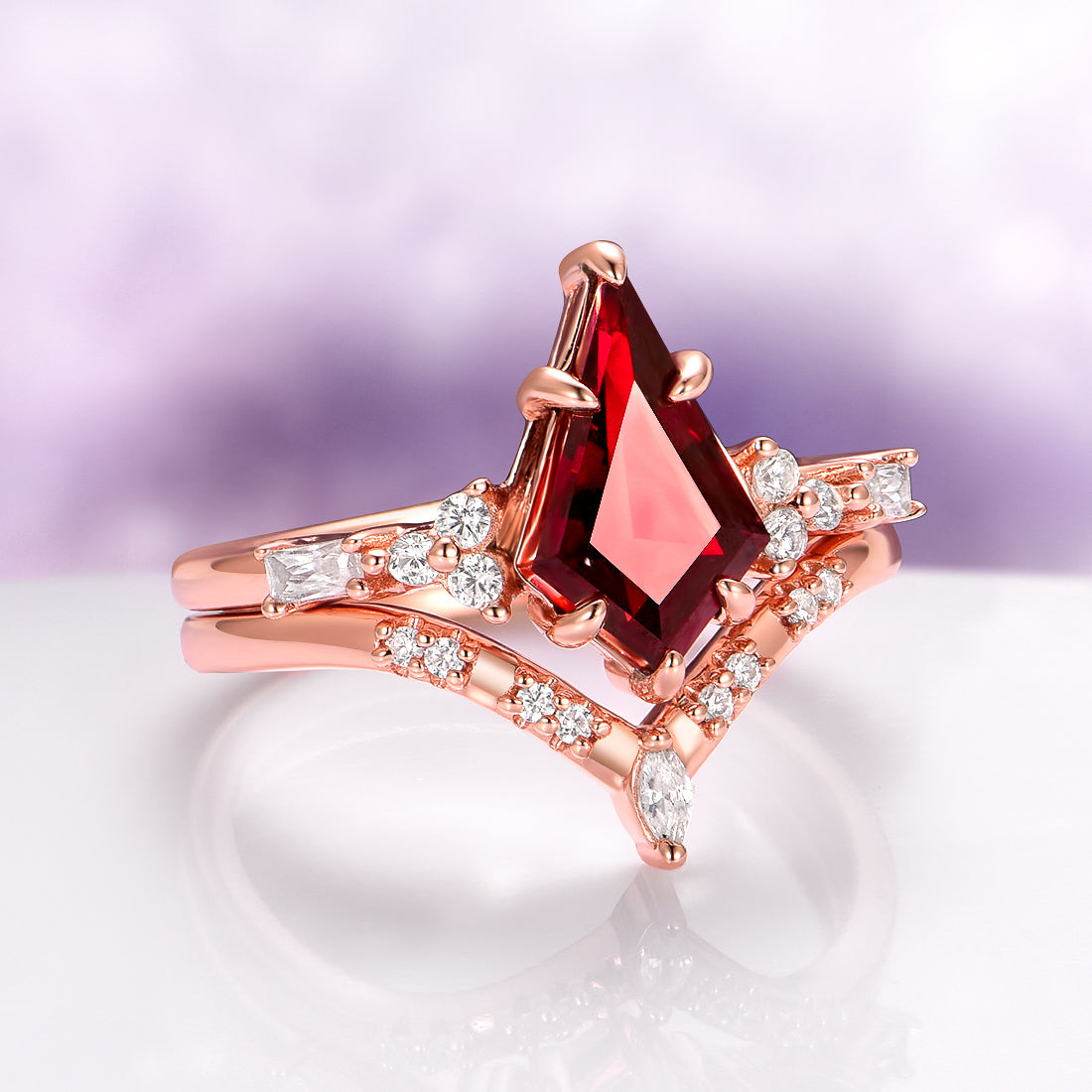 The women’s ring showcases a dramatic kite cut natural garnet, glowing with rich deep red tones that symbolize passion and enduring love. The gemstone is set in a romantic 14K rose gold vermeil lotus-inspired setting, accented with sparkling stones that enhance the bold geometric silhouette of the center stone.