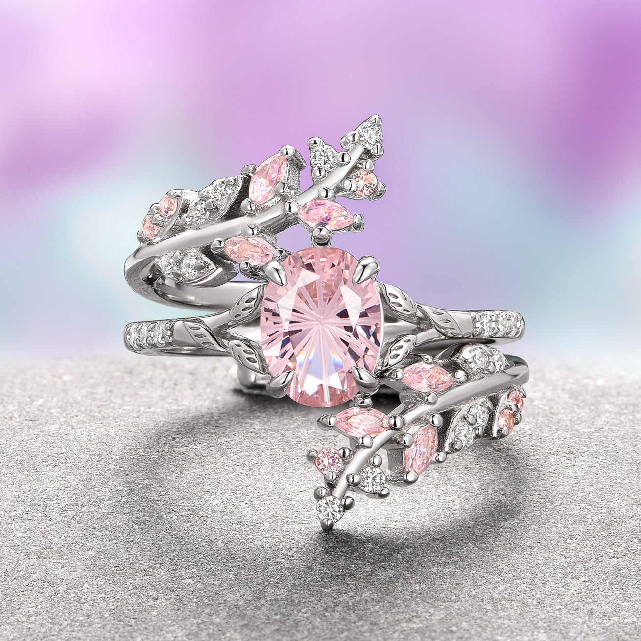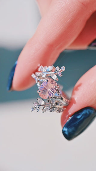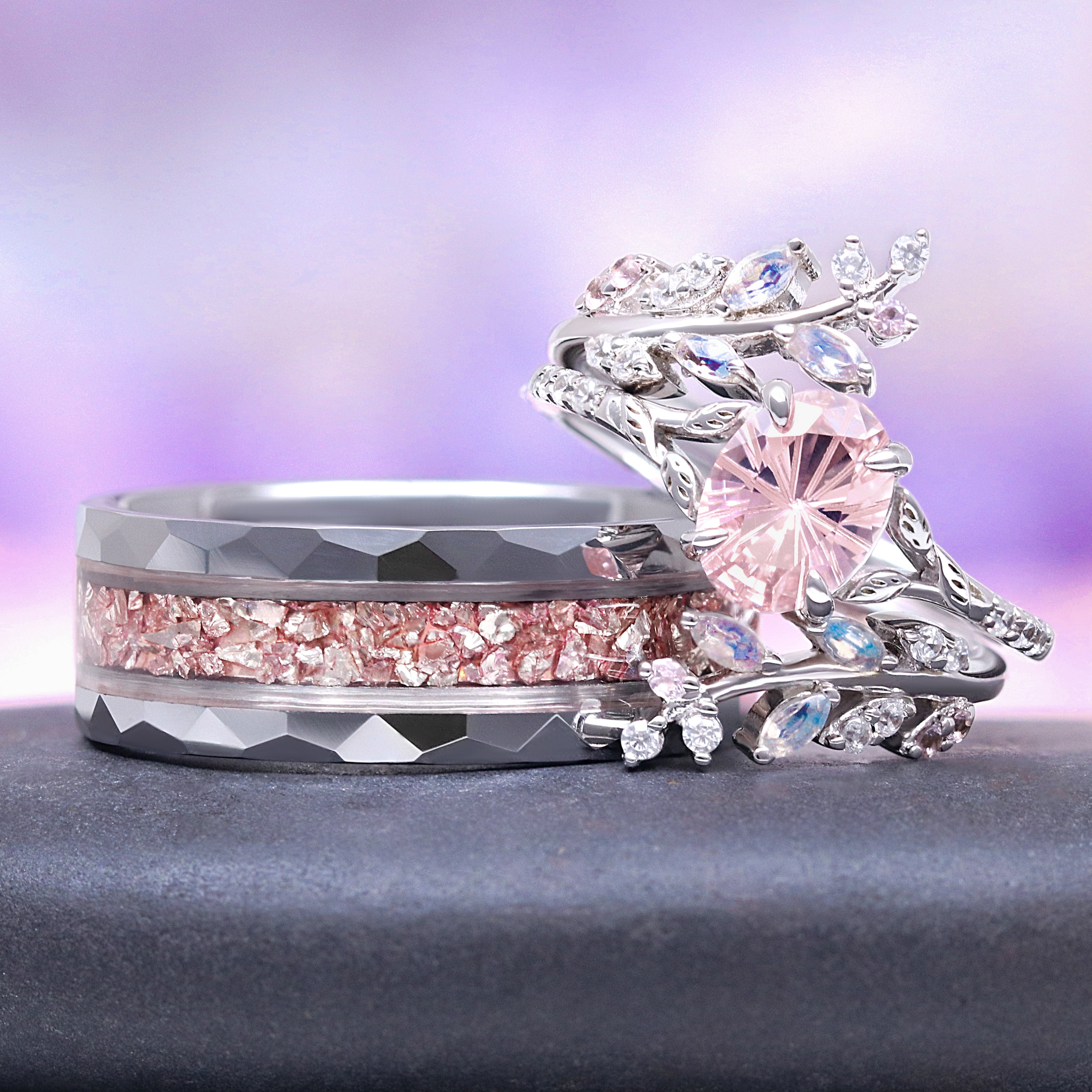 Celebrate your love with the Fantasy Star Cut Morganite Leaf Couples Ring Set, a radiant blend of modern craftsmanship and timeless romance. Created for couples who want rings as unique as their bond, this set combines strength with elegance and symbolism. The warmth of morganite represents compassion and harmony, while moonstone and shimmering simulated diamond (CZ) accents bring a touch of mystery and brilliance, making this set the perfect expression of enduring love.