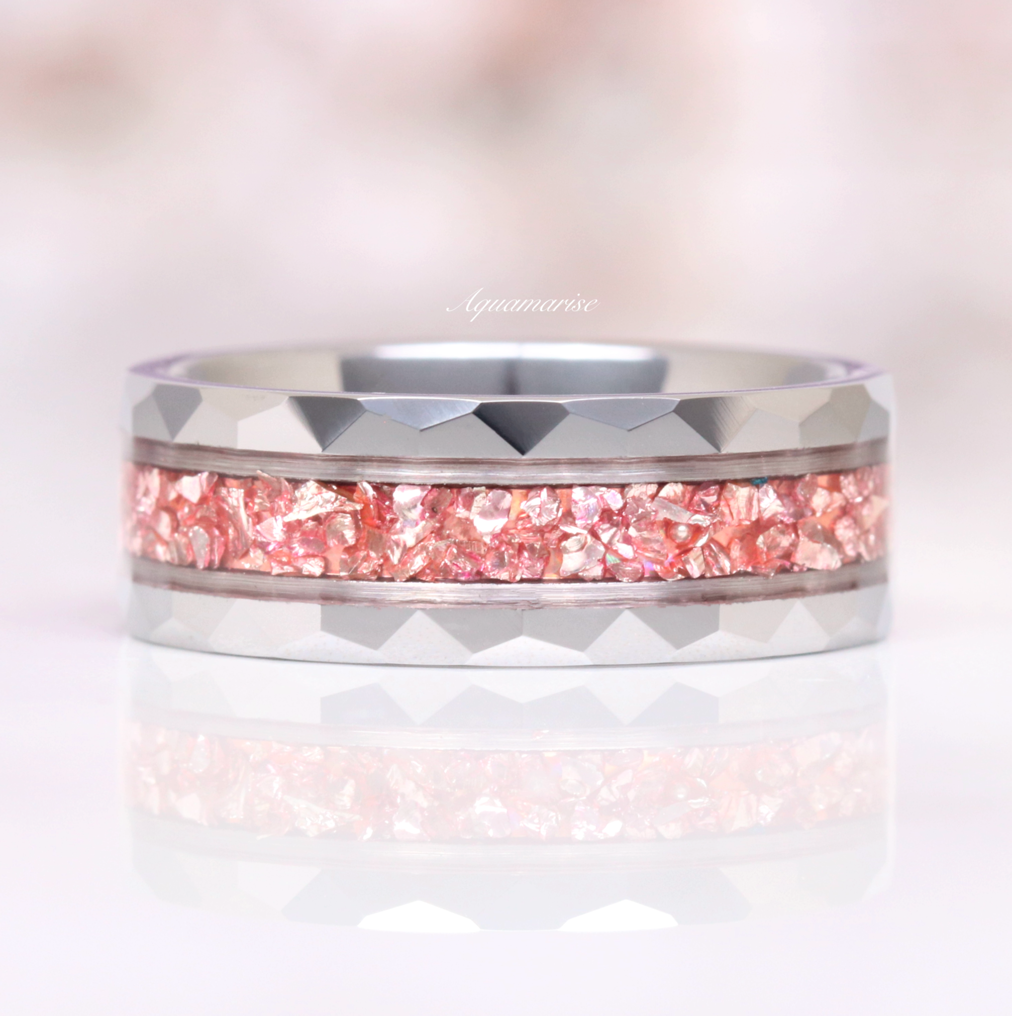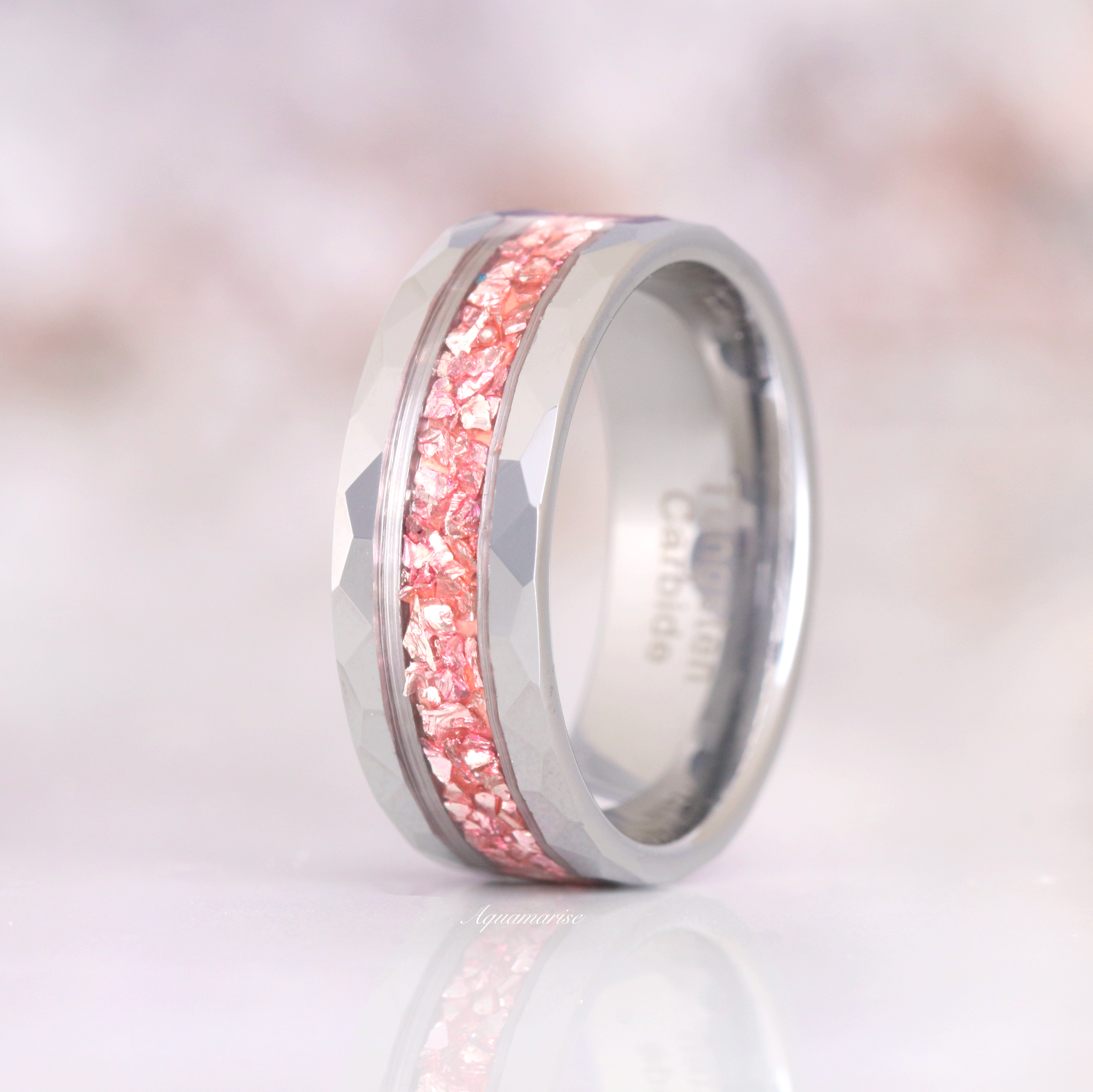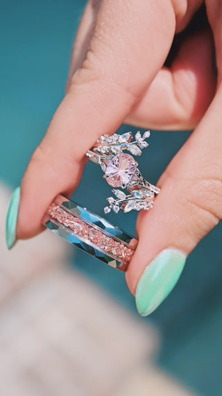 ► His Ring: Crafted from durable tungsten carbide, this 8mm band features a bold hammered polished finish with a striking morganite inlay. Designed with a comfort-fit interior, it symbolizes resilience, devotion, and modern style while remaining comfortable for everyday wear.