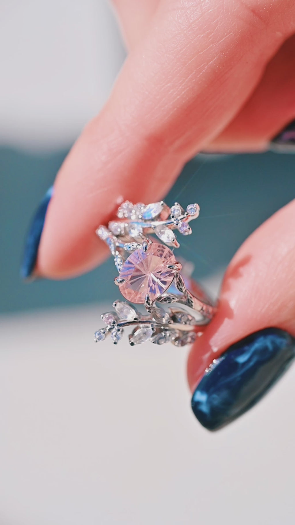 ► Her Ring: Elegant and enchanting, her 925 solid sterling silver engagement ring showcases an 8x6mm (approx. 1.2 ct.) fantasy star cut simulated morganite center stone. Accented with sparkling simulated diamonds (CZ), delicate simulated morganite, and luminous natural moonstones, this design captures romance and celestial beauty in one unforgettable piece.