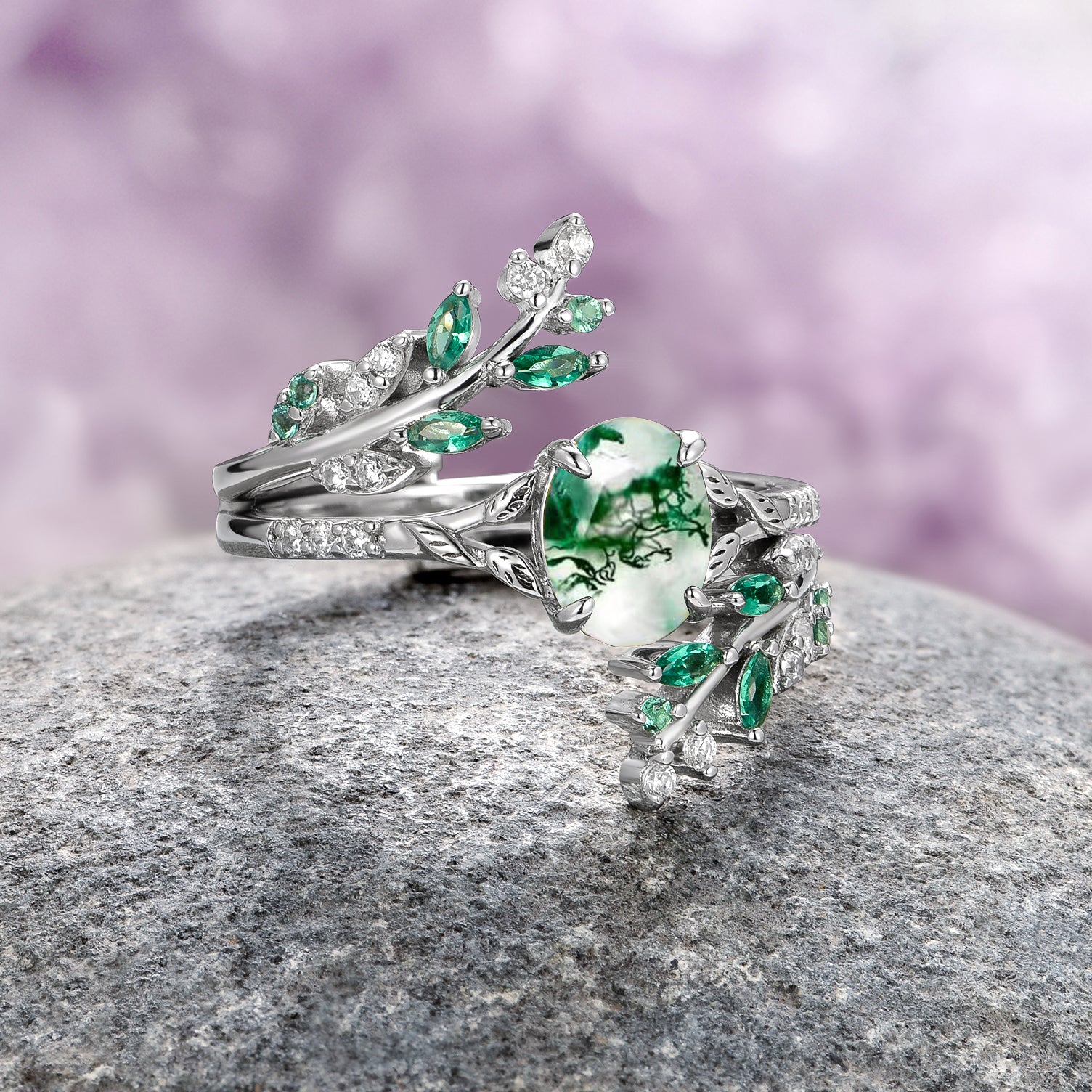 Moss Agate & Emerald Fairy Leaf Couples Ring Set
