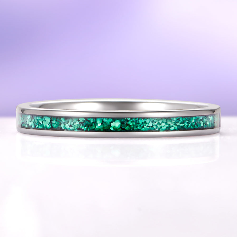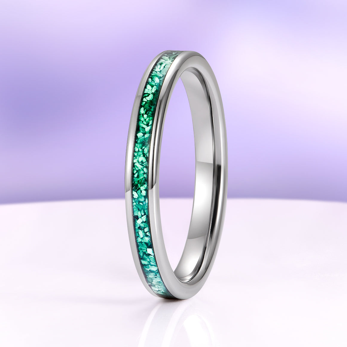 ► Her Ring: Sleek and refined, her 2mm polished tungsten carbide band features a natural crushed malachite inlay. Slim and minimalist in style, this ring offers everyday elegance while carrying the symbolism of harmony and renewal.