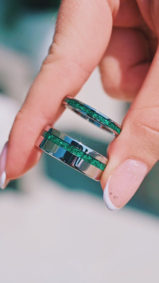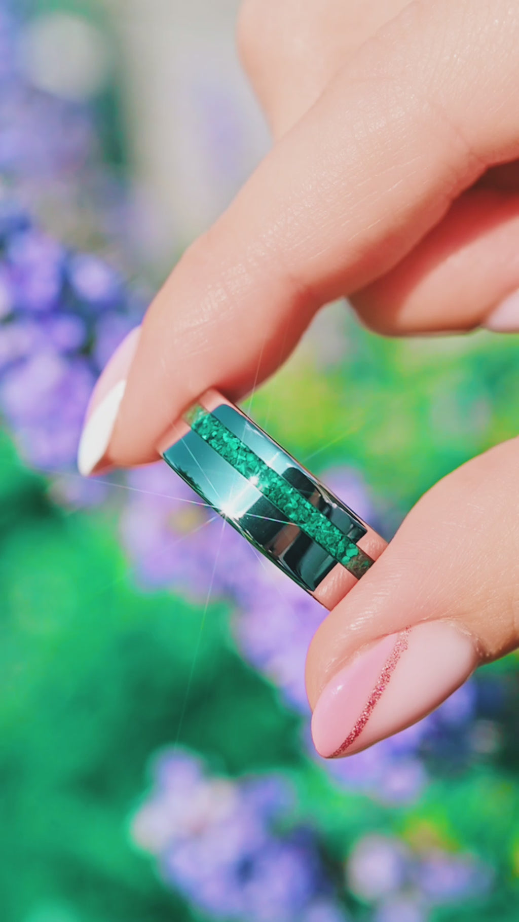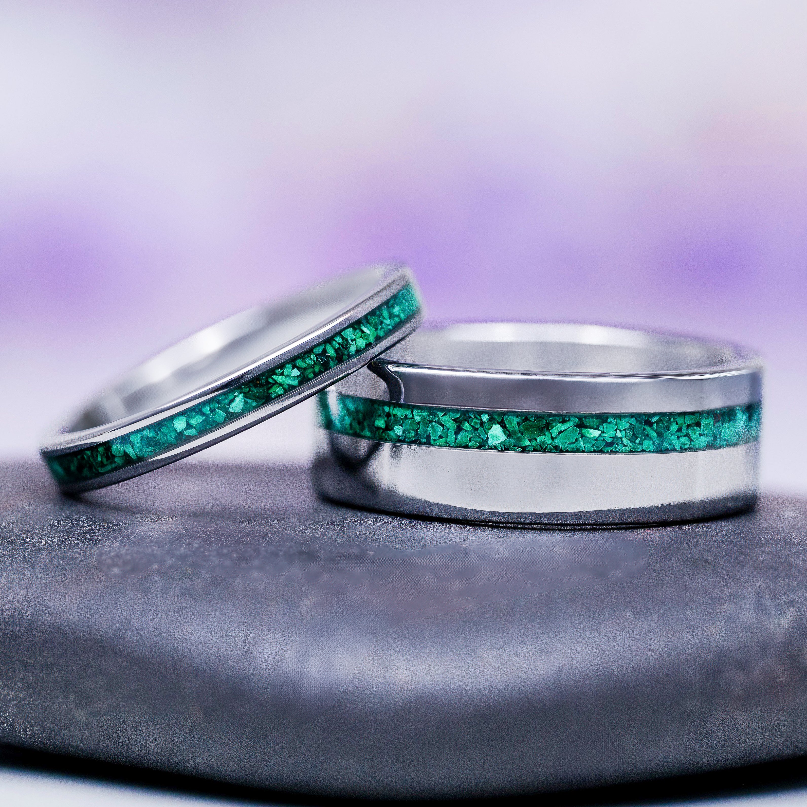 ► His Ring: Crafted from polished tungsten carbide, his bold 8mm band showcases an offset inlay of natural crushed malachite. Designed with a comfort-fit interior, this ring pairs lasting durability with modern sophistication.