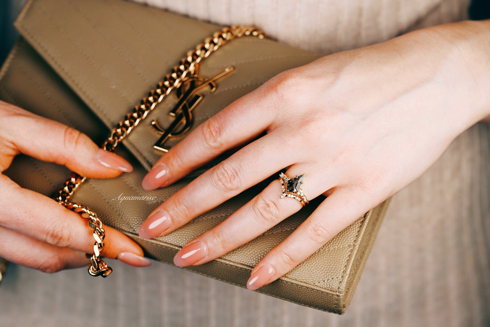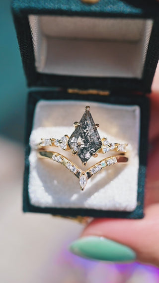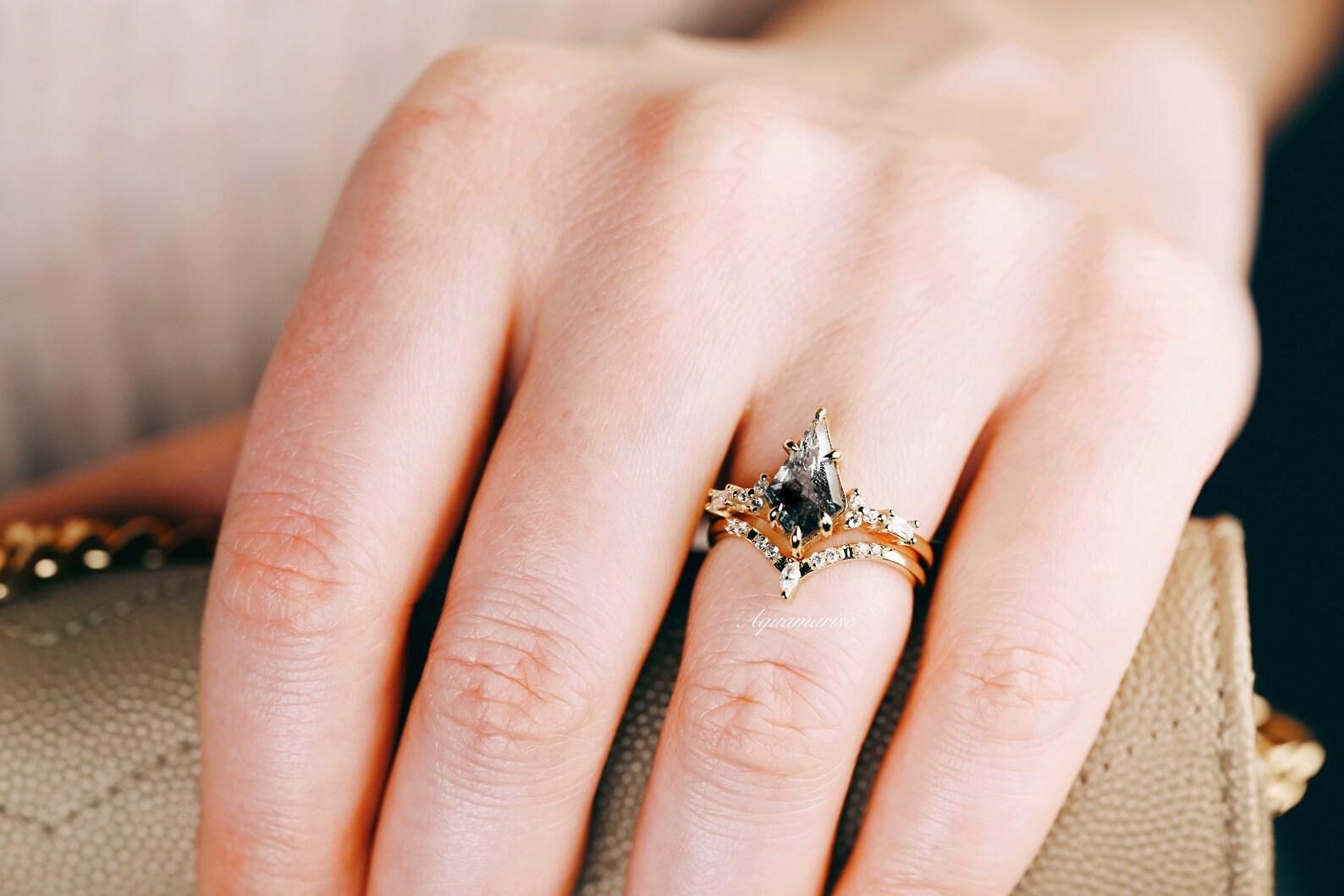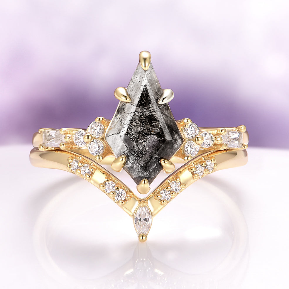 ► Her Ring: From our signature Skye Kite® collection, her engagement ring is crafted in luminous 14k yellow gold vermeil over 925 sterling silver and features a striking 6x12mm (approx. 1.7 ct) natural Herkimer diamond in a distinctive kite cut. Accented with shimmering CZ stones, this unique design celebrates individuality, cosmic beauty, and everlasting devotion.