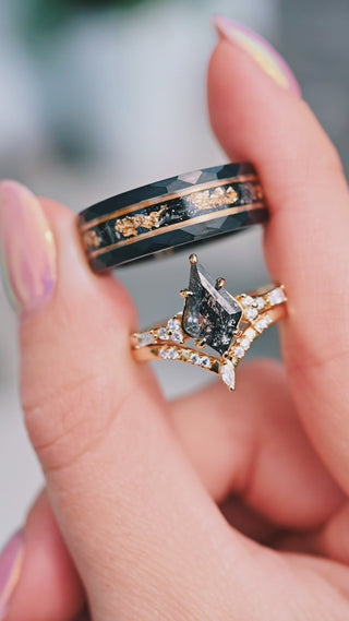 ► His Ring: Crafted in durable tungsten carbide, this 8mm band showcases a rugged brushed black hammered finish, accented with a sleek brushed yellow gold strip. The inlay features genuine meteorite fragments mixed with yellow gold leaf, symbolizing a love as timeless and infinite as the stars. Designed with a comfort-fit interior, it is both bold and enduring for everyday wear.