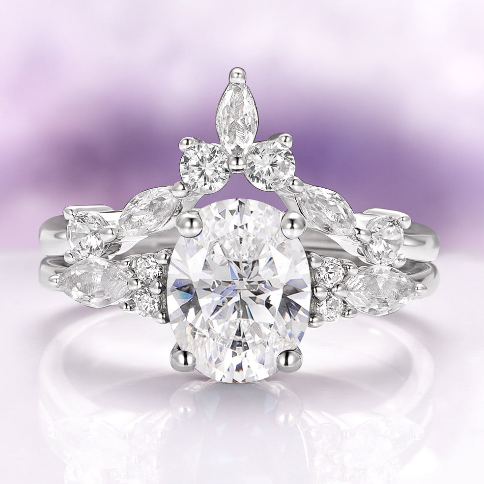 This elegant white sapphire bridal ring set blends timeless beauty with modern sophistication. Featuring a sparkling oval-cut lab-grown white sapphire as the centerpiece, this design is a stunning diamond alternative for engagements, anniversaries, or September birthstone gifts. Handcrafted in solid 925 sterling silver with a rhodium finish, it offers lasting brilliance and durability while maintaining an effortlessly refined look.