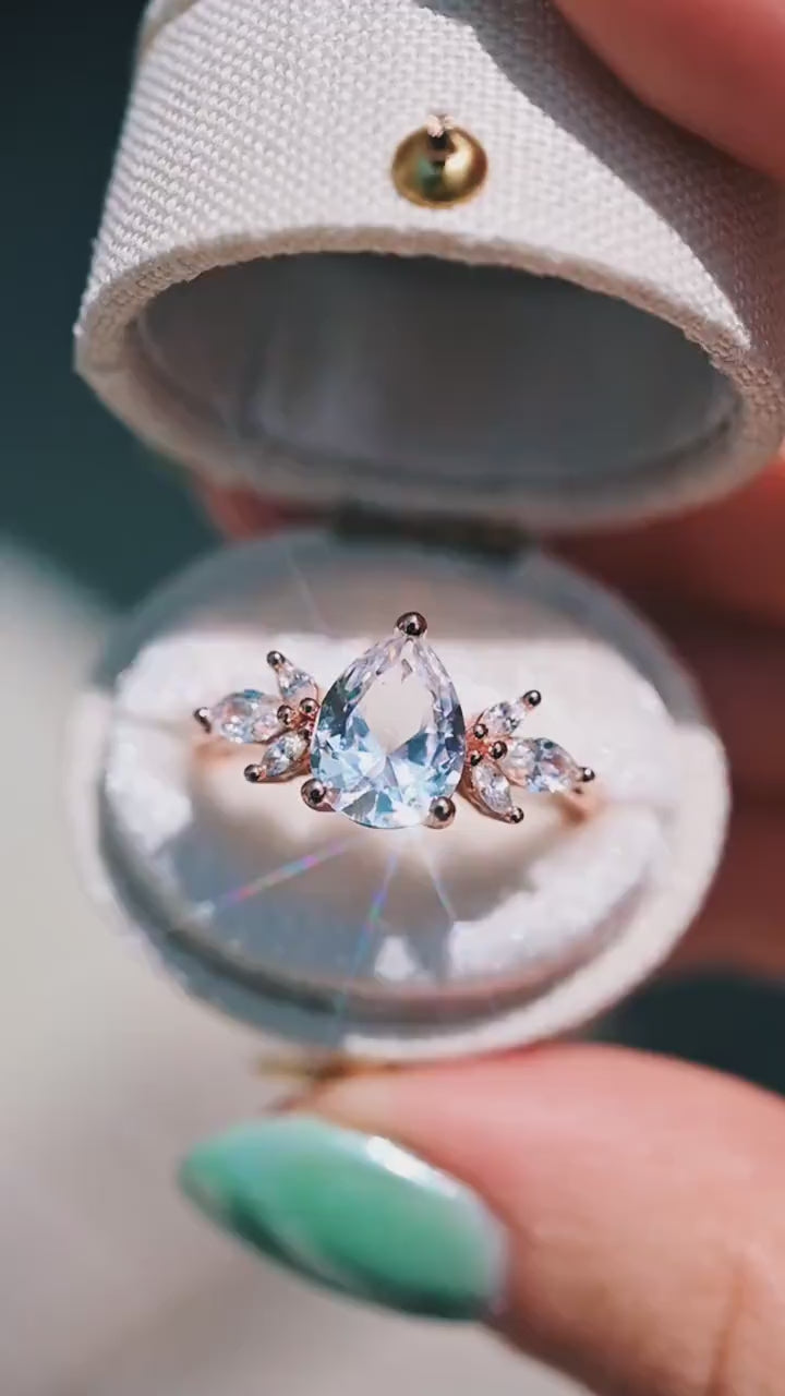 Radiant and refined, this teardrop white sapphire ring features a stunning 2-carat pear-cut lab-grown sapphire, accented by sparkling marquise-cut simulated diamonds that create a delicate floral motif. Crafted in 14K rose gold over 925 solid sterling silver, this piece captures timeless beauty with a modern romantic touch. Perfect as an engagement ring, promise ring, or birthstone ring, it makes an unforgettable statement of love and elegance.