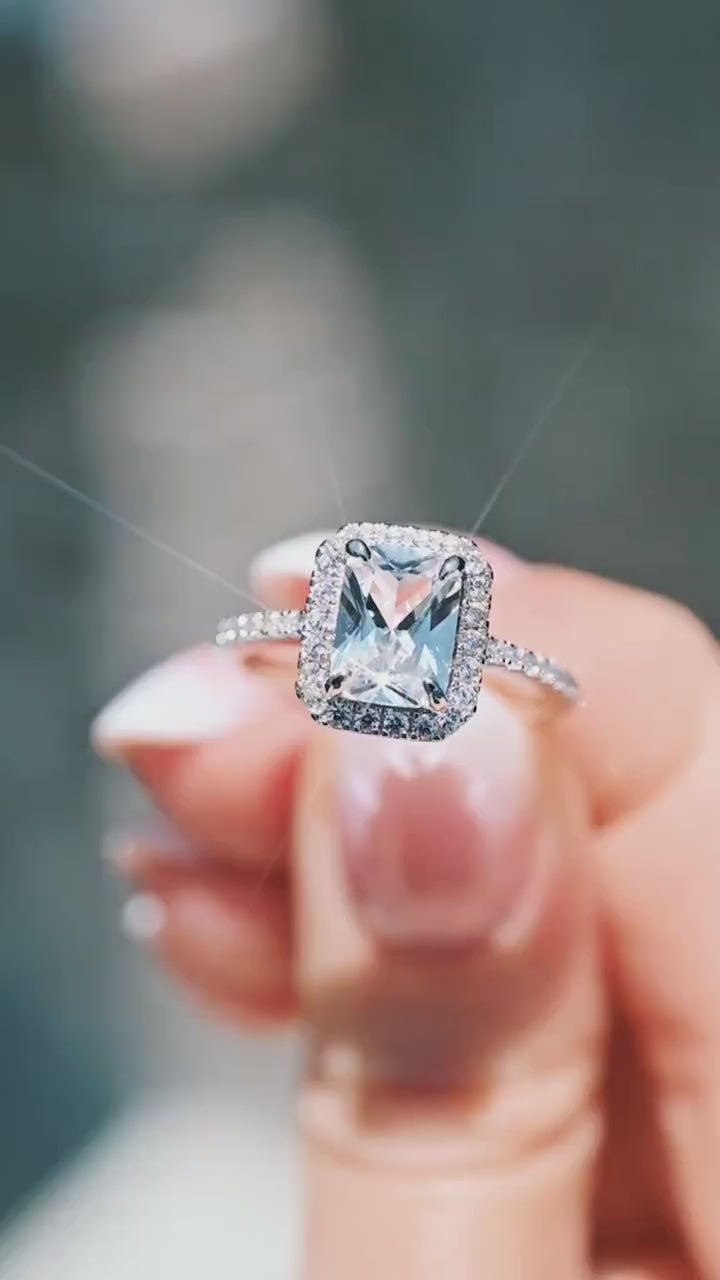 The halo of sparkling simulated diamonds enhances the center stone’s brilliance, creating a luxurious look reminiscent of fine diamond engagement rings — at an accessible price point. Crafted in solid 925 sterling silver with a protective rhodium finish, this ring delivers both durability and long-lasting shine.