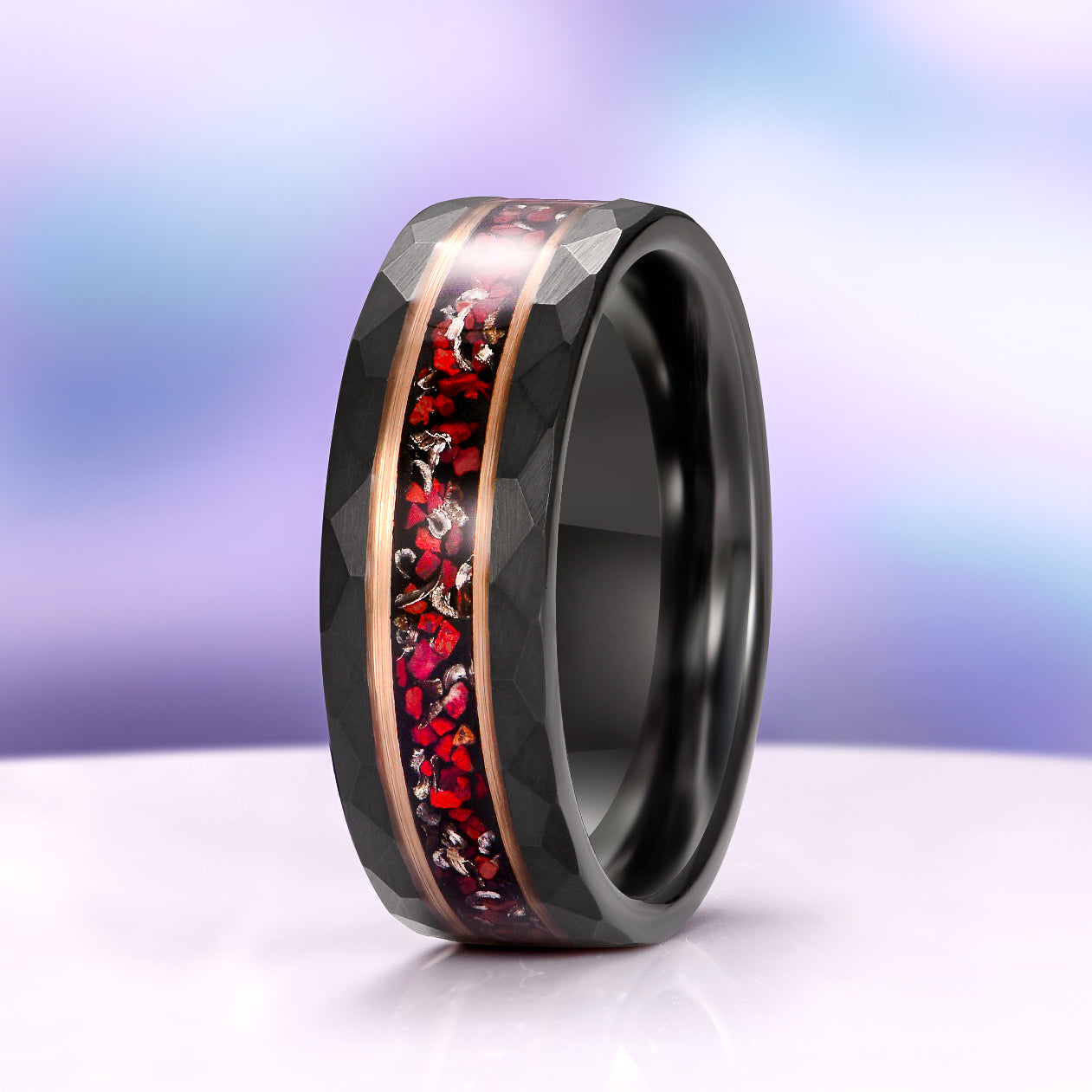 Dinosaur Bone & Meteorite Hammered Wedding Band in Black/Rose Gold Tungsten Carbide (8mm)