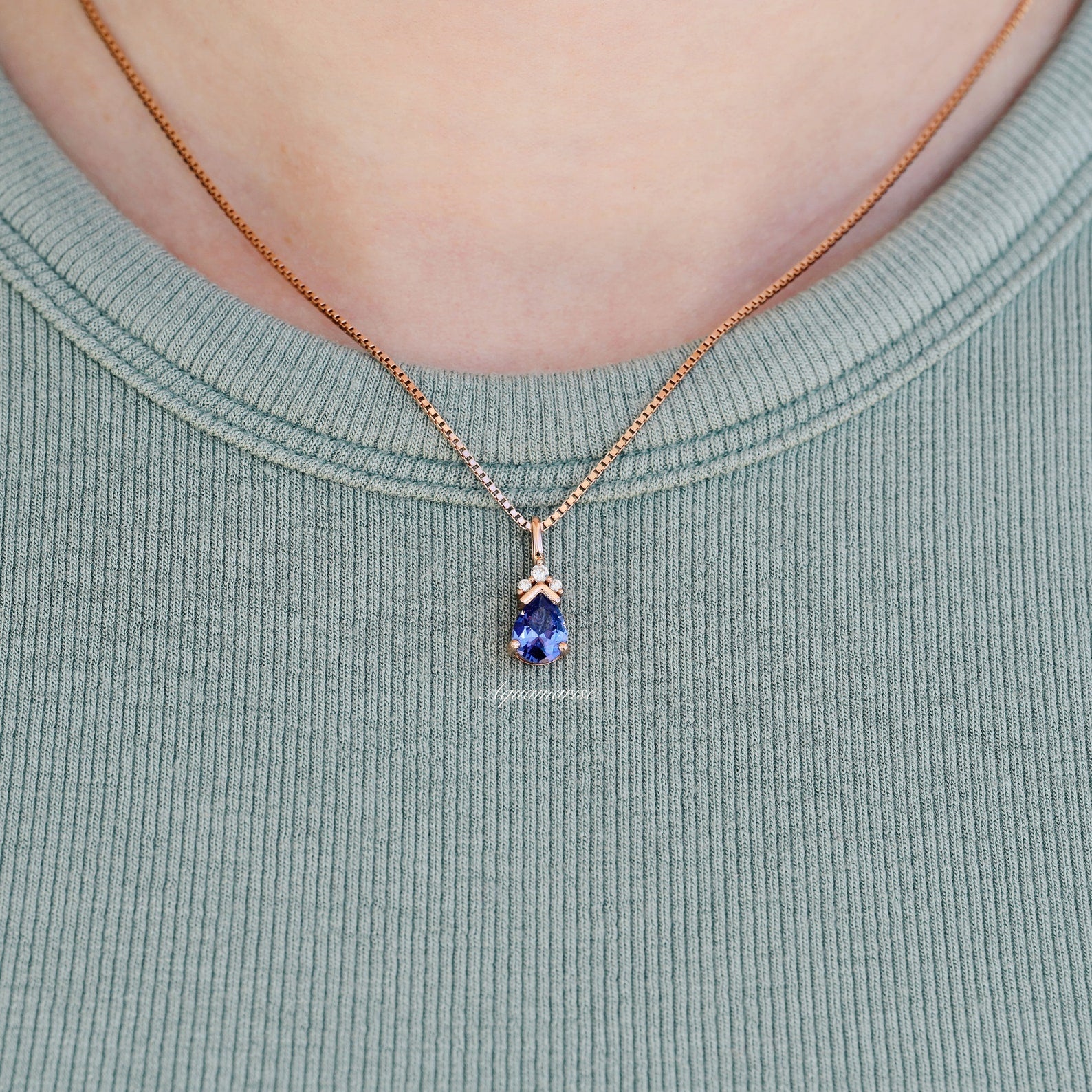 ►The pendant features a gracefully sculpted teardrop-shaped lab-created Tanzanite gemstone, renowned for its enchanting violet-blue hue, exuding a sense of refinement and mystique. Encased within the warmth of the 14K Rose Gold Vermeil setting, the necklace radiates a soft, rosy glow, adding a touch of subtle luxury to any ensemble.