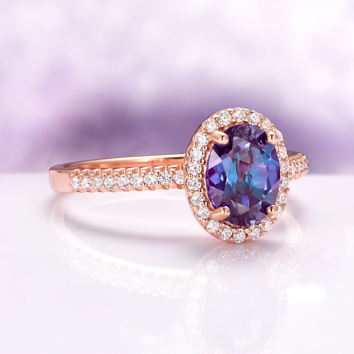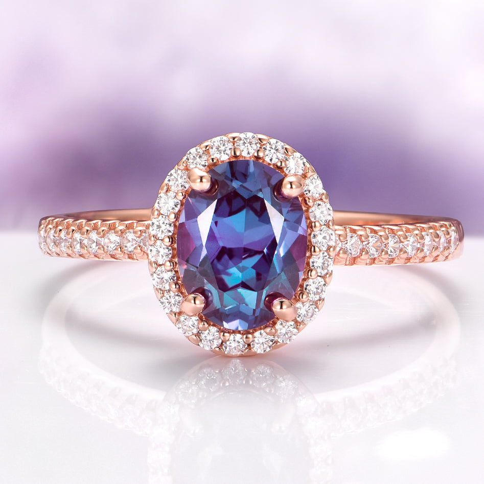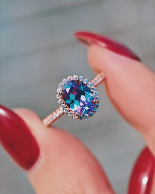 Delicate and radiant, the Iris Alexandrite Ring in 14K Solid Rose Gold features a mesmerizing lab-grown Alexandrite center stone in a graceful halo setting, accented by sparkling moissanite or natural diamonds. This non-traditional engagement ring offers timeless elegance with a magical, color-changing twist.