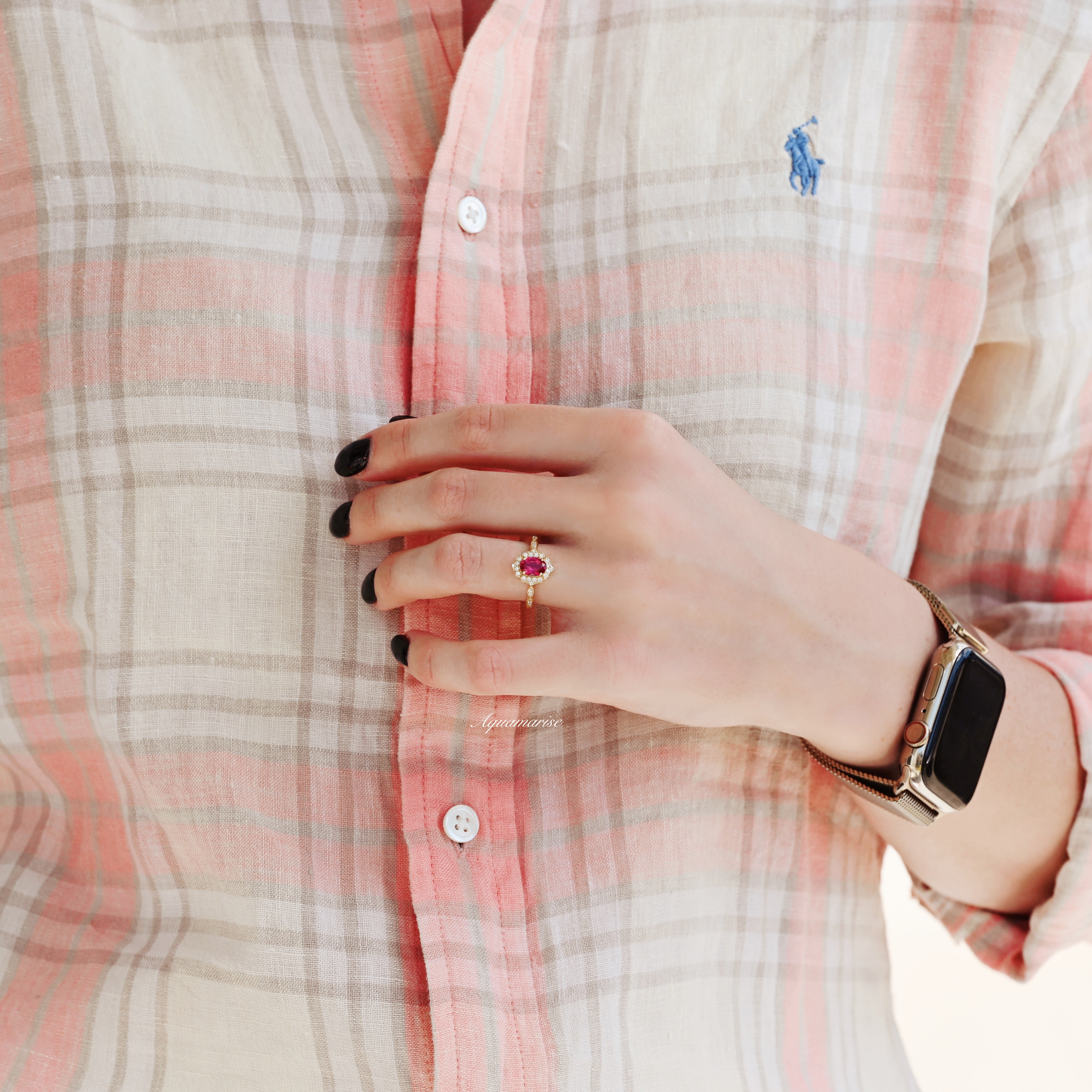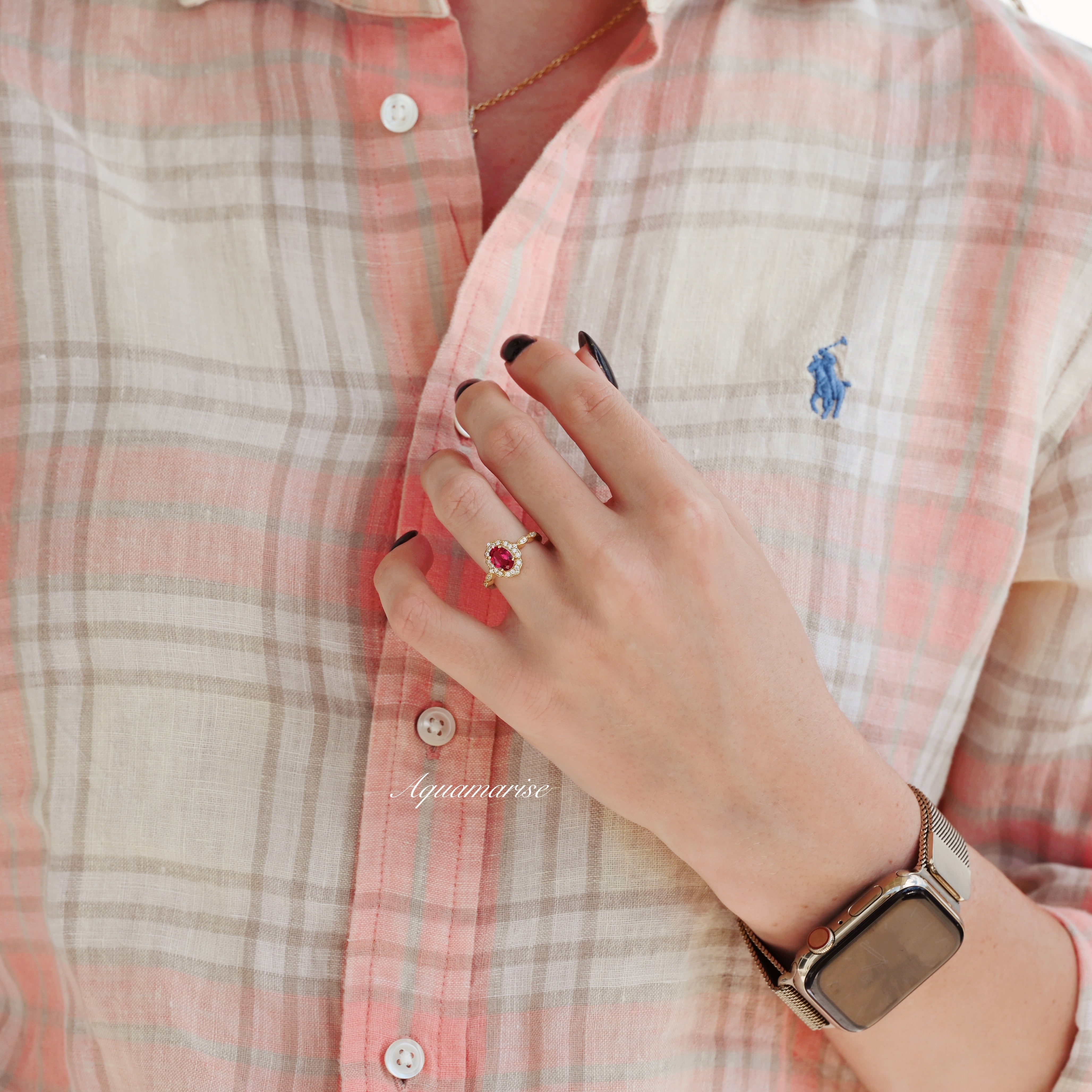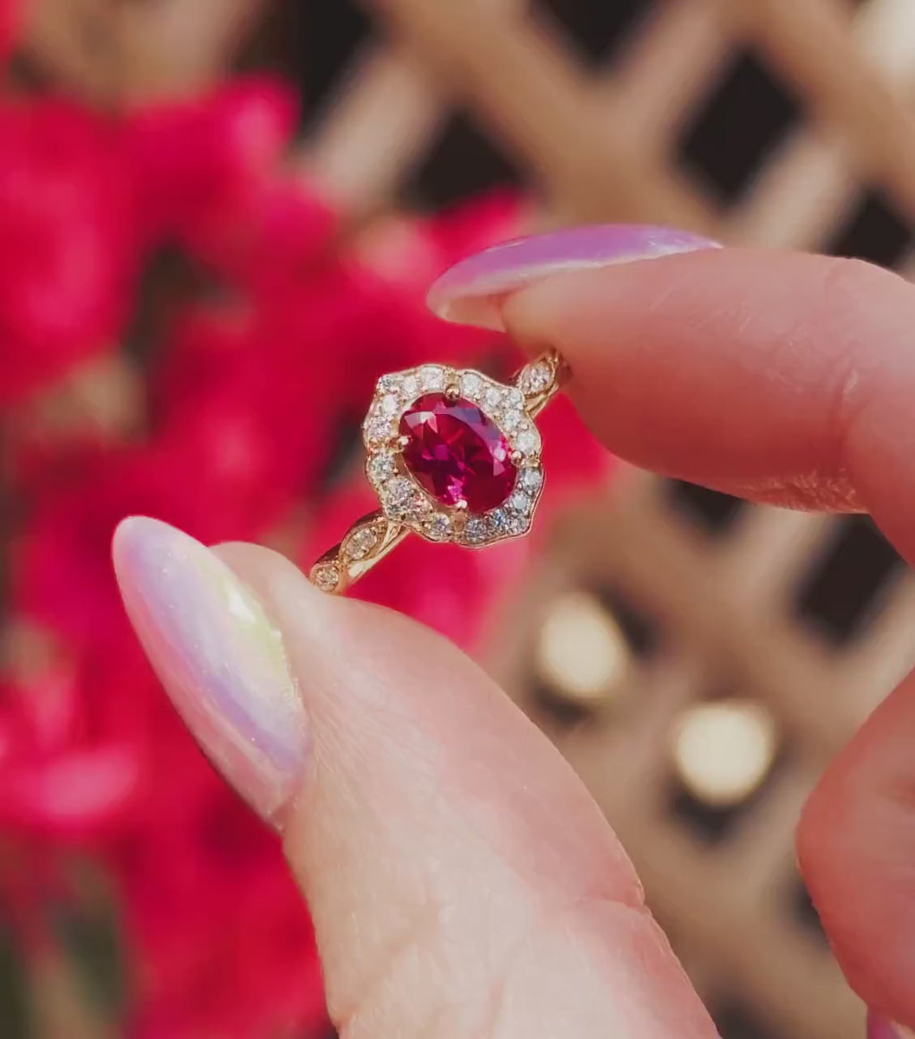 Timeless and bold, this Vintage Ruby Ring in 14K solid yellow gold blends antique charm with rich elegance. An oval-cut ruby sits at the center, radiating passion and strength. Framed by sparkling moissanite accent stones in a vintage-inspired setting, this ring captures the essence of enduring love, perfect for romantic souls and those drawn to deep, vibrant color and vintage design.