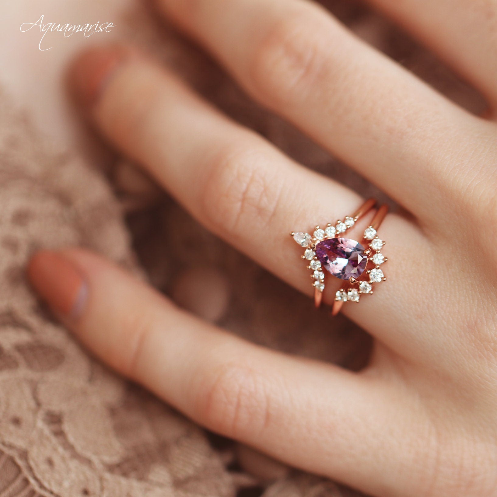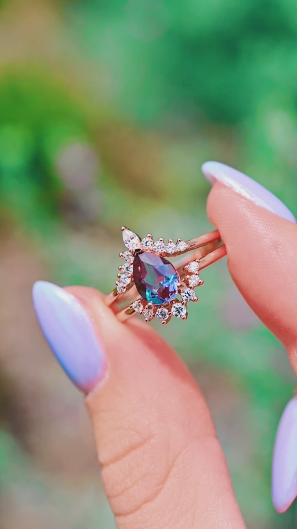 Lunette Teardrop Alexandrite Engagement Ring Set in 14K Solid Rose Gold