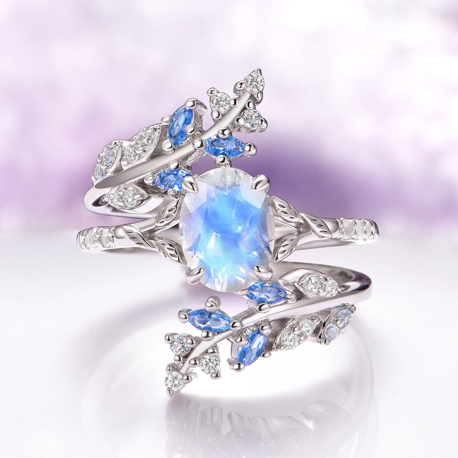 ► Embrace the magic of nature with this enchanting Moonstone and Aquamarine Leaf Engagement Ring Set, crafted in solid 14K white gold. Inspired by fantasy realms and fairycore aesthetics, this two-piece ring set captures the ethereal beauty of moonlight and forest dew.
