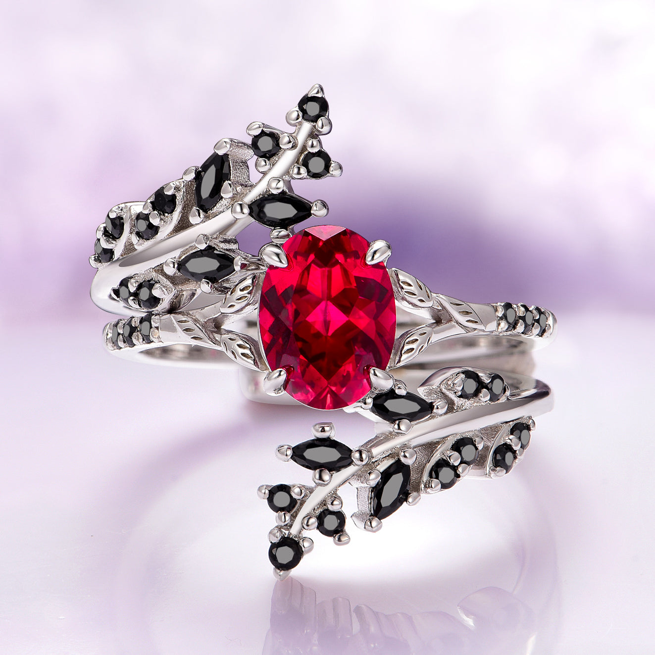 Step into enchantment with our Ruby & Black Onyx Leaf Fairy Engagement Ring Set, a striking fusion of fiery passion and dark elegance. Handcrafted in 14K solid white gold, this two-piece set features a captivating ruby, symbolizing love, strength, and vitality. Its vivid red hue evokes timeless romance and devotion, making it the perfect center stone for a meaningful, unconventional engagement.