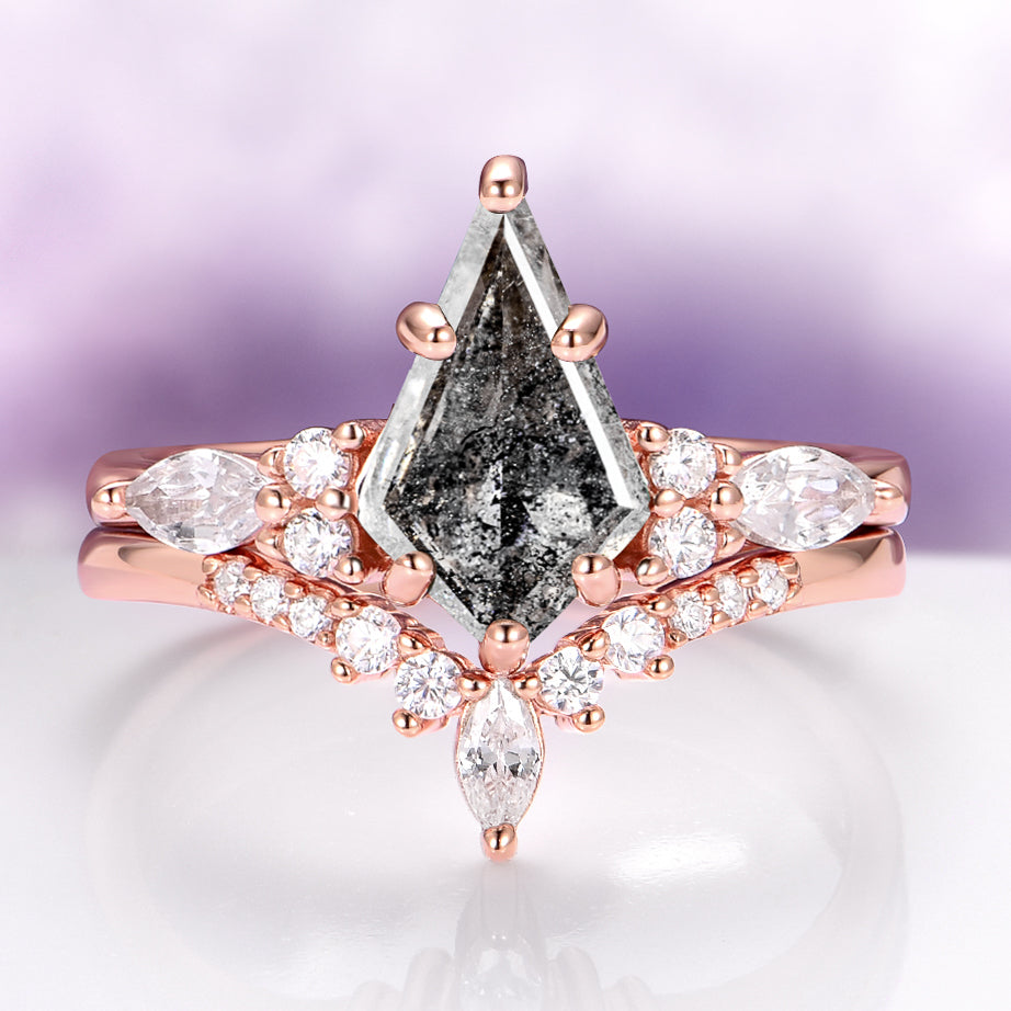 Discover celestial beauty with the Skye Salt & Pepper Diamond (Natural Herkimer Diamond) Engagement Ring Set, meticulously crafted in 14K rose gold. This unique ring set features a captivating natural Herkimer diamond, known for its raw, salt and pepper appearance that sparkles with a unique blend of light and dark inclusions. The Herkimer diamond is a perfect alternative to traditional diamonds, offering a stunning, organic beauty that symbolizes individuality and love.