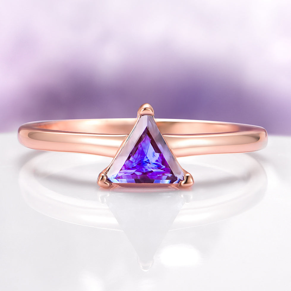 Minimal yet mesmerizing, this Triangle Cut Alexandrite Solitaire Ring in 14k solid rose gold features a captivating lab-grown Alexandrite in a rare triangle cut. With its clean, modern silhouette and dynamic color-shifting beauty, this ring offers a stunning balance of simplicity and intrigue. Perfect as an alternative engagement ring or a meaningful gift, this piece is ideal for those drawn to unique gemstones and contemporary design.