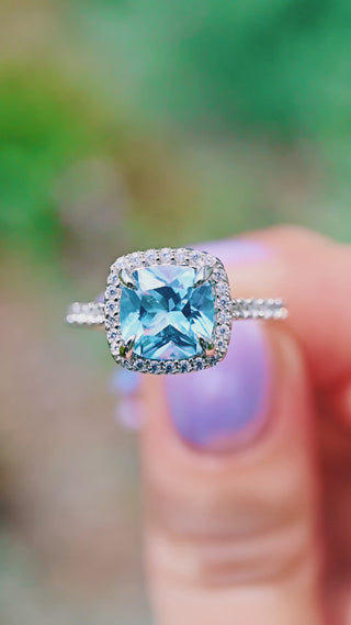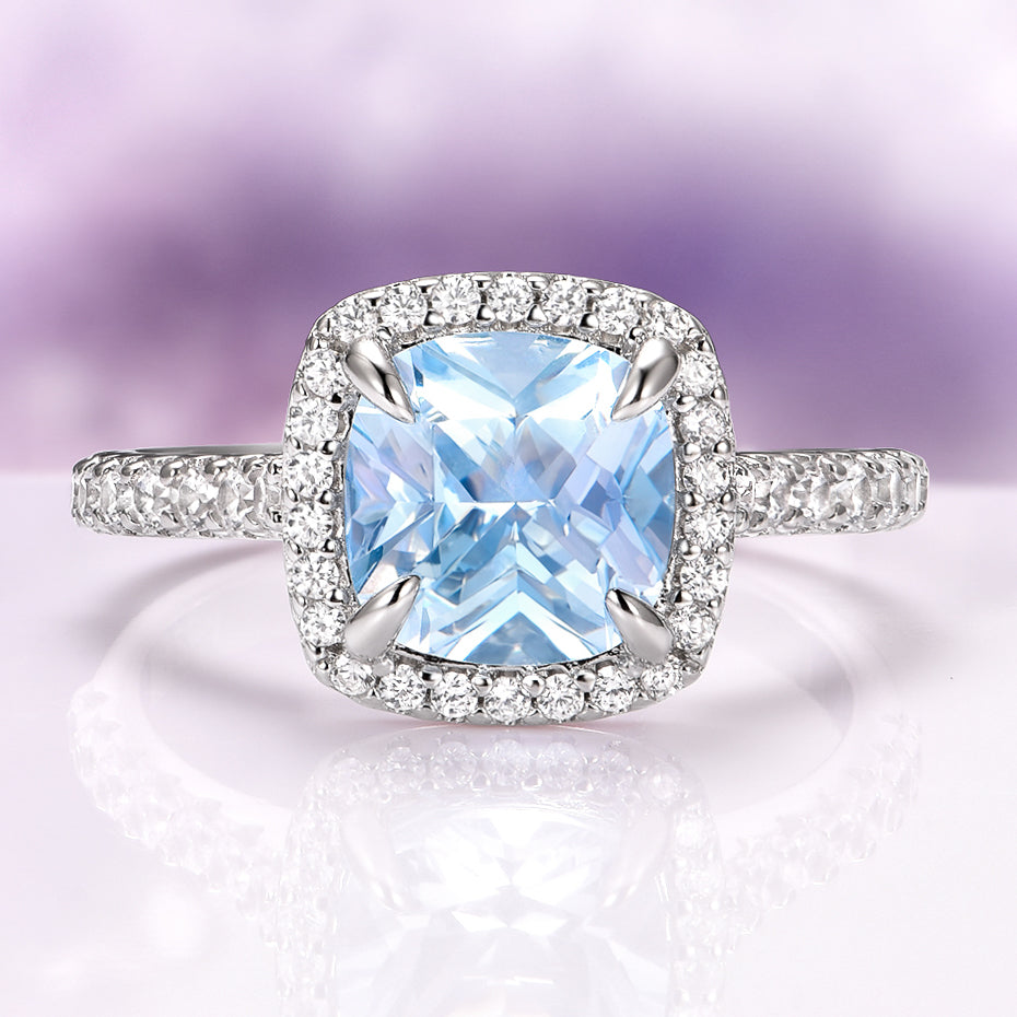 Celebrate timeless elegance with this cushion-cut aquamarine ring, beautifully crafted in 925 solid sterling silver. Featuring a brilliant 2.5 carat lab-created aquamarine in a classic halo setting, this ring radiates soft, serene blue tones that symbolize clarity, peace, and loyalty. Whether chosen as a March birthstone ring, promise ring, or engagement ring, it’s a stunning statement of love and intention.