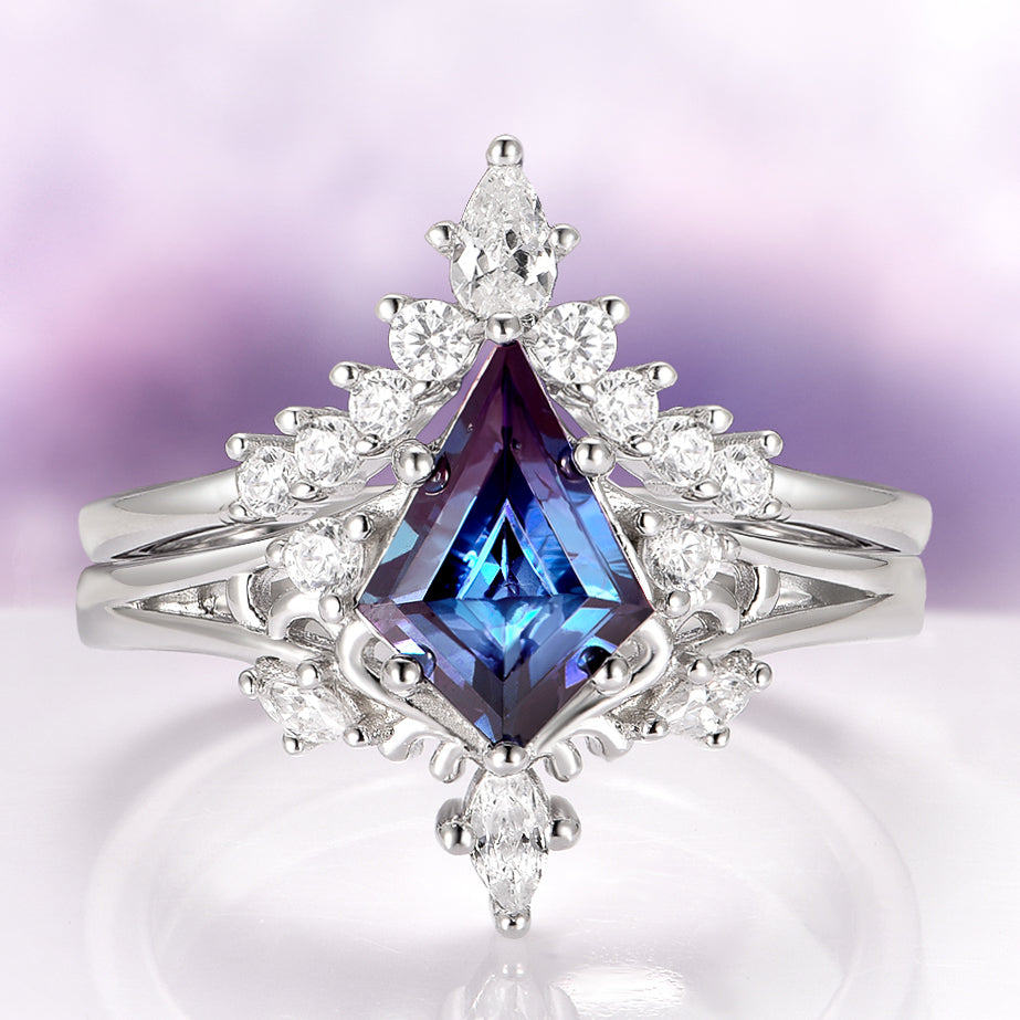 Step into a world of enchantment with this breathtaking two-piece lab grown alexandrite ring set, designed for those who dream beyond the ordinary.