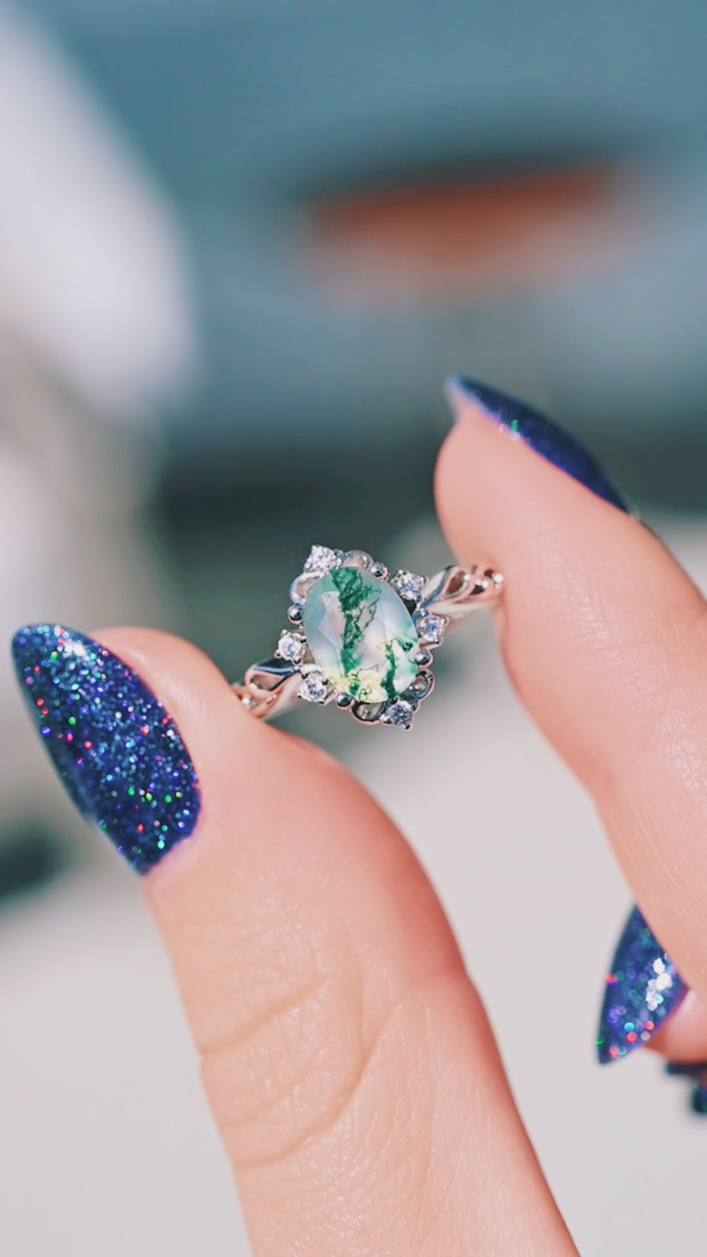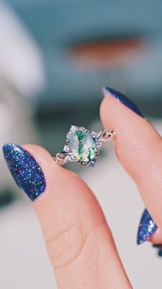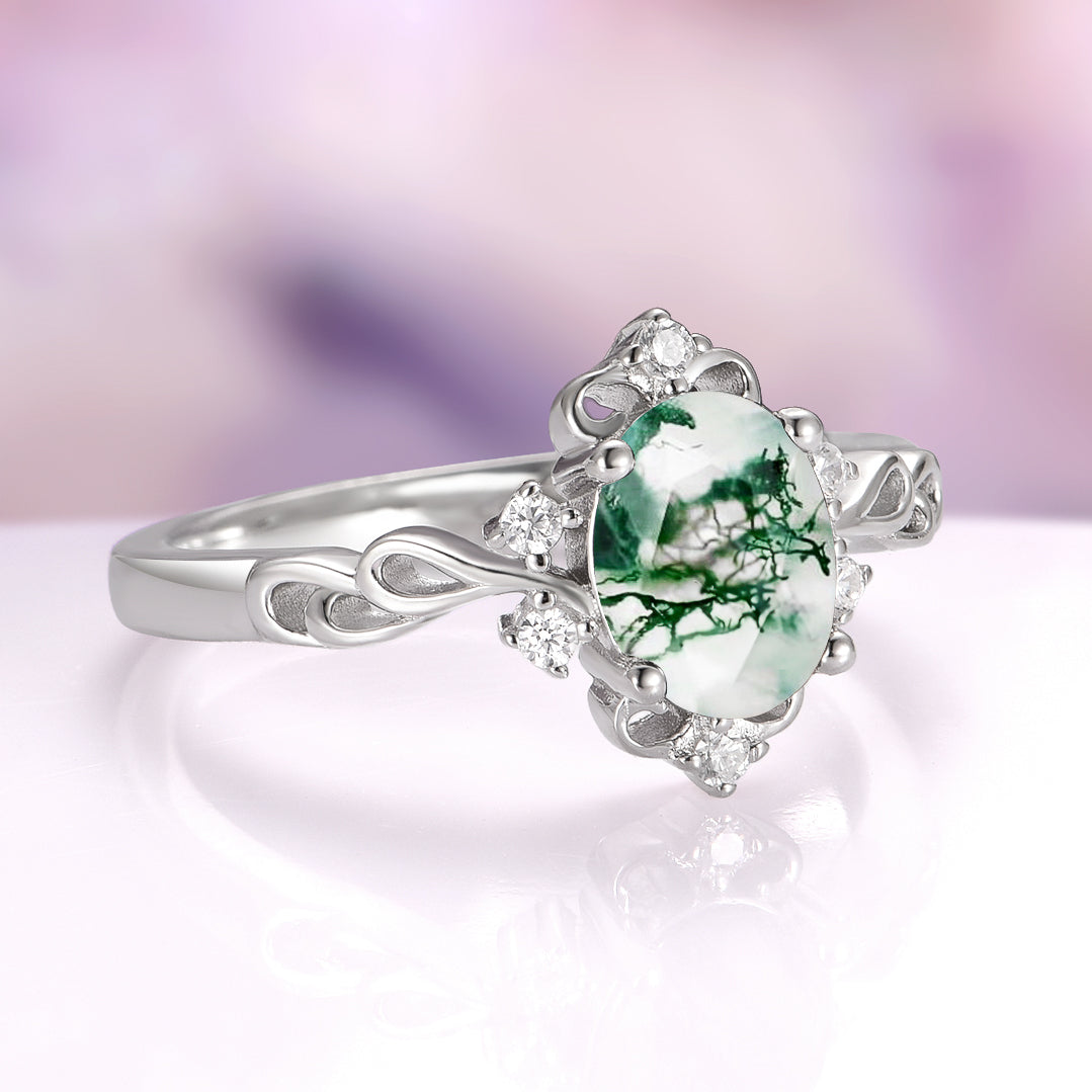 This enchanting ring captures the essence of a fairytale forest. Crafted in solid 925 sterling silver, it features a natural green moss agate center stone — each gem showcasing one-of-a-kind inclusions that resemble tiny forests captured in stone. The delicate twirl band and sparkling simulated diamond accents evoke the light and movement of woodland magic, making it the perfect choice for a non-traditional engagement ring.