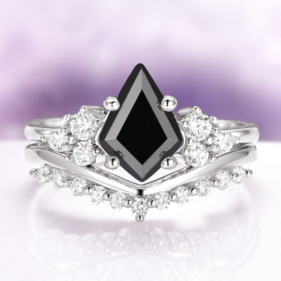 Add timeless elegance with this Vintage Inspired Kite Cut Black Onyx Engagement Ring Set, crafted in 925 sterling silver with a rhodium finish. The striking kite-shaped natural black onyx center stone (6.0 x 10.0 mm, approx. 1.4 ct.) creates a bold, gothic statement—perfect for engagements, anniversaries, or meaningful promise rings.