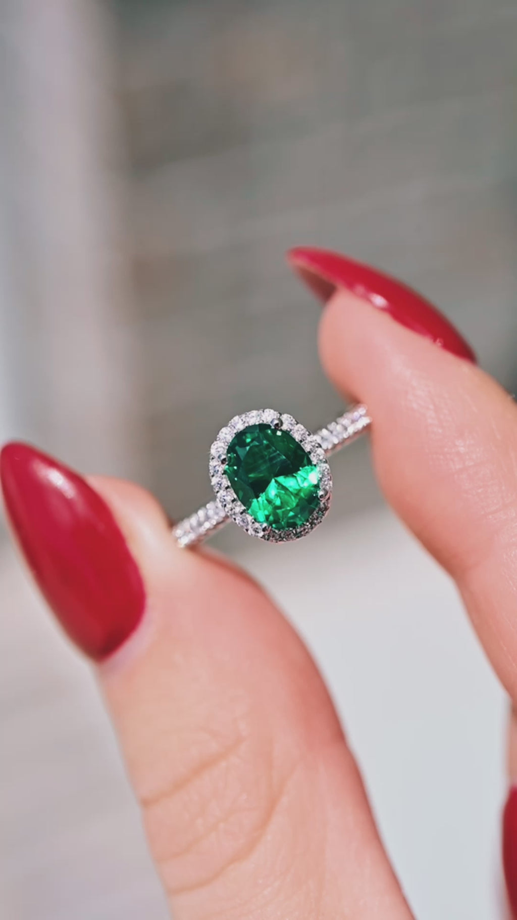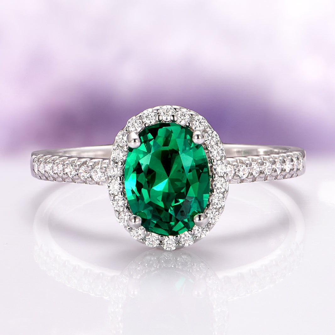 Gorgeous Oval Halo Emerald Ring – Sterling Silver Green Engagement Ring | May Birthstone Promise Ring | Vintage-Inspired Ring for Her