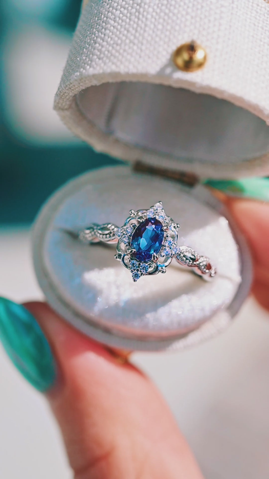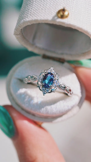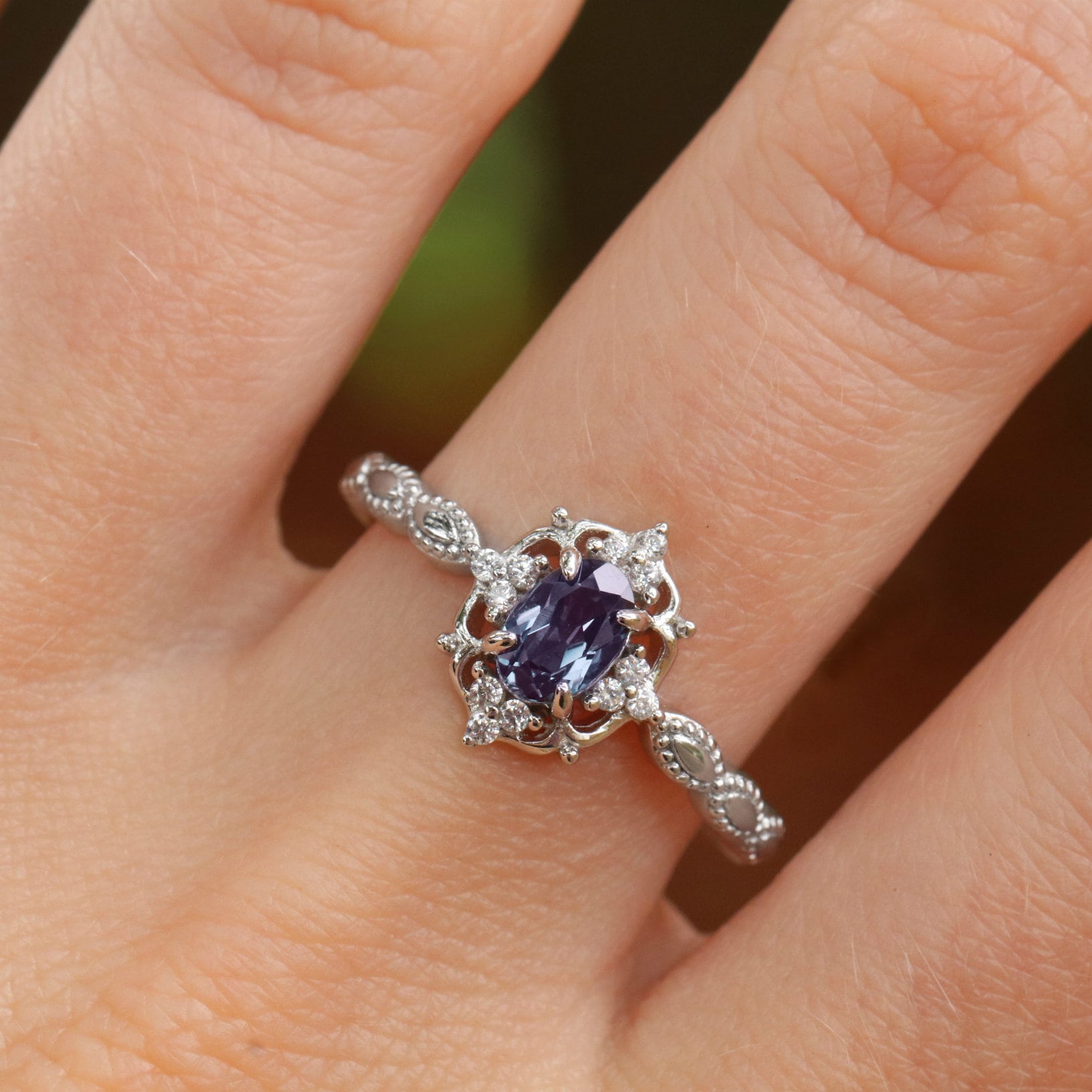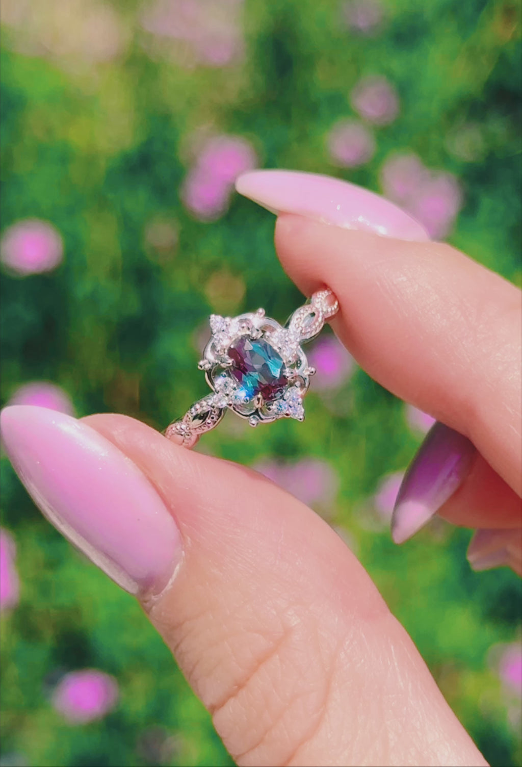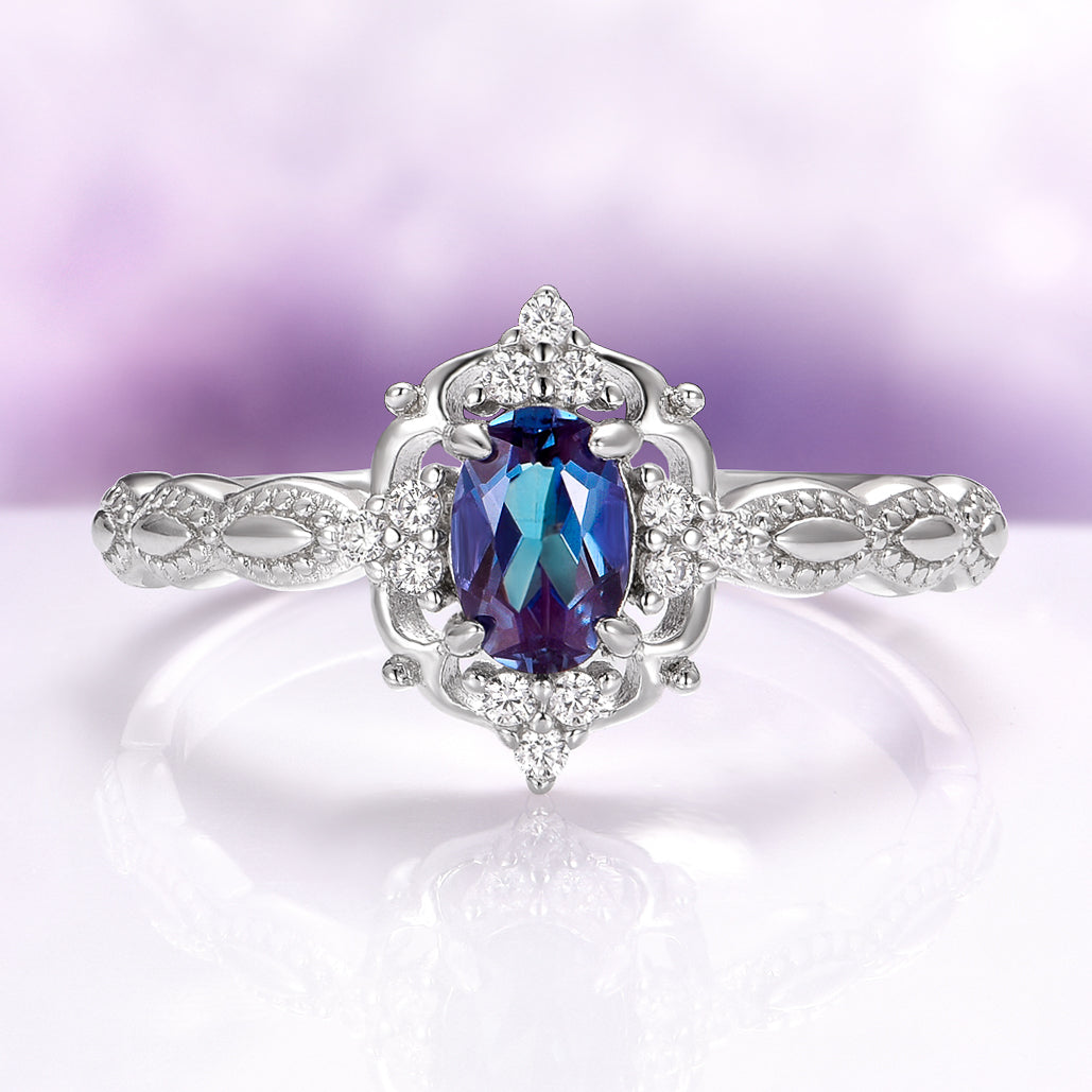 The stunning oval-cut lab-grown Alexandrite displays a mesmerizing color shift between purple, teal, and blue—changing beautifully under different lighting conditions. Accented with sparkling simulated diamonds, this ring is as unique as the love it symbolizes.