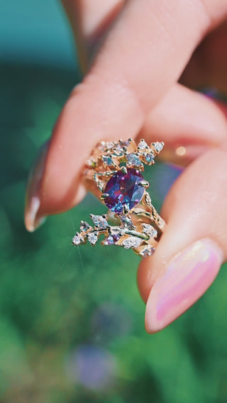 Alexandrite Leaf Engagement Ring Set in 14K Solid Yellow Gold