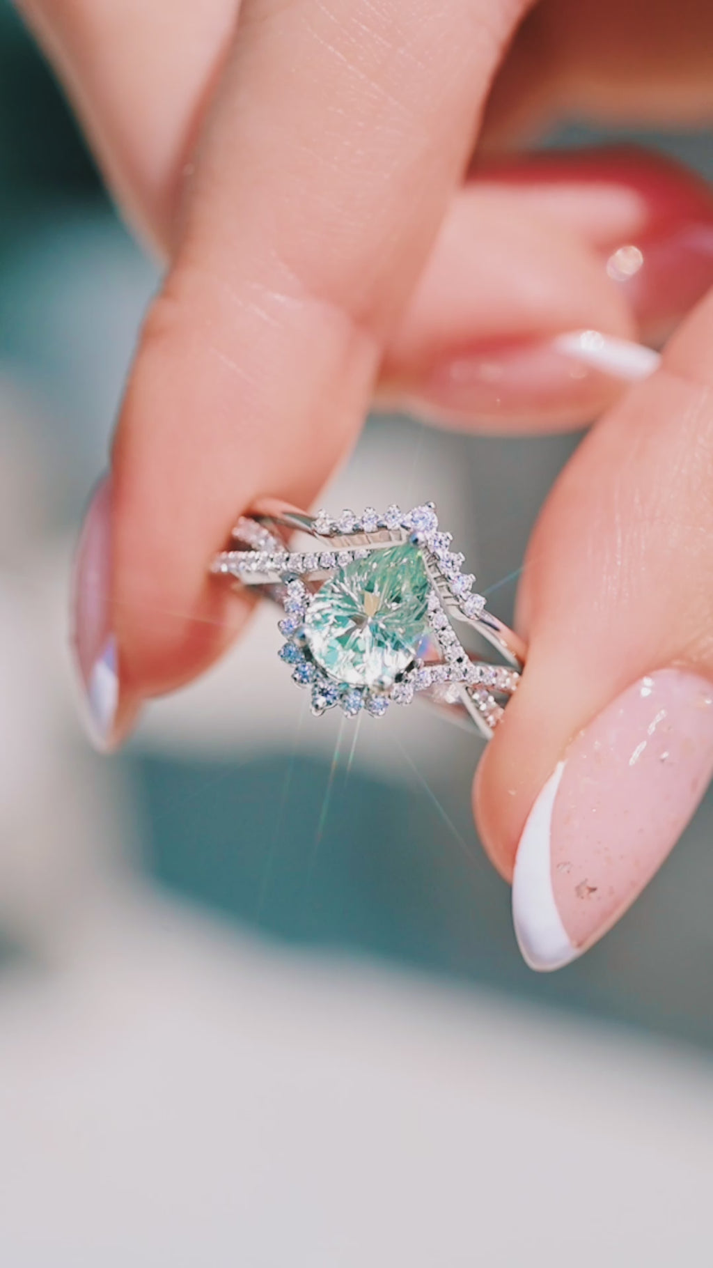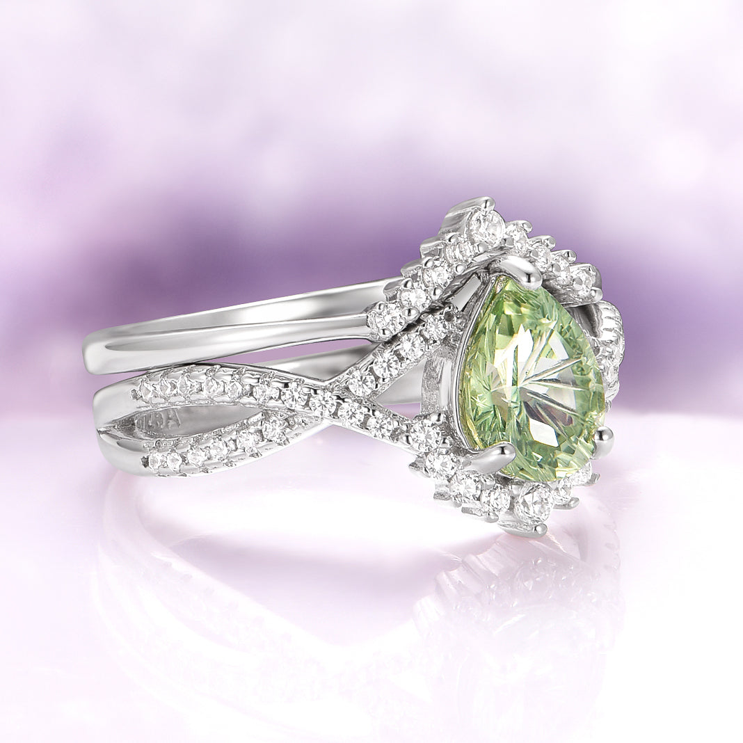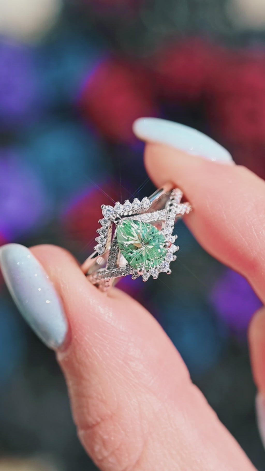 Alice Fireworks Cut Light Green Sapphire Engagement Ring Set in 14K White Gold